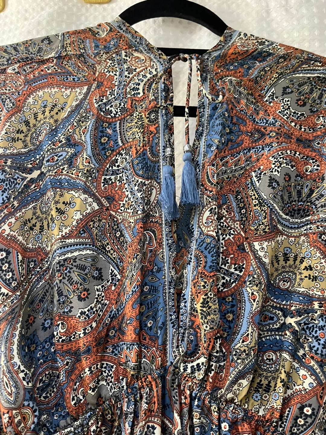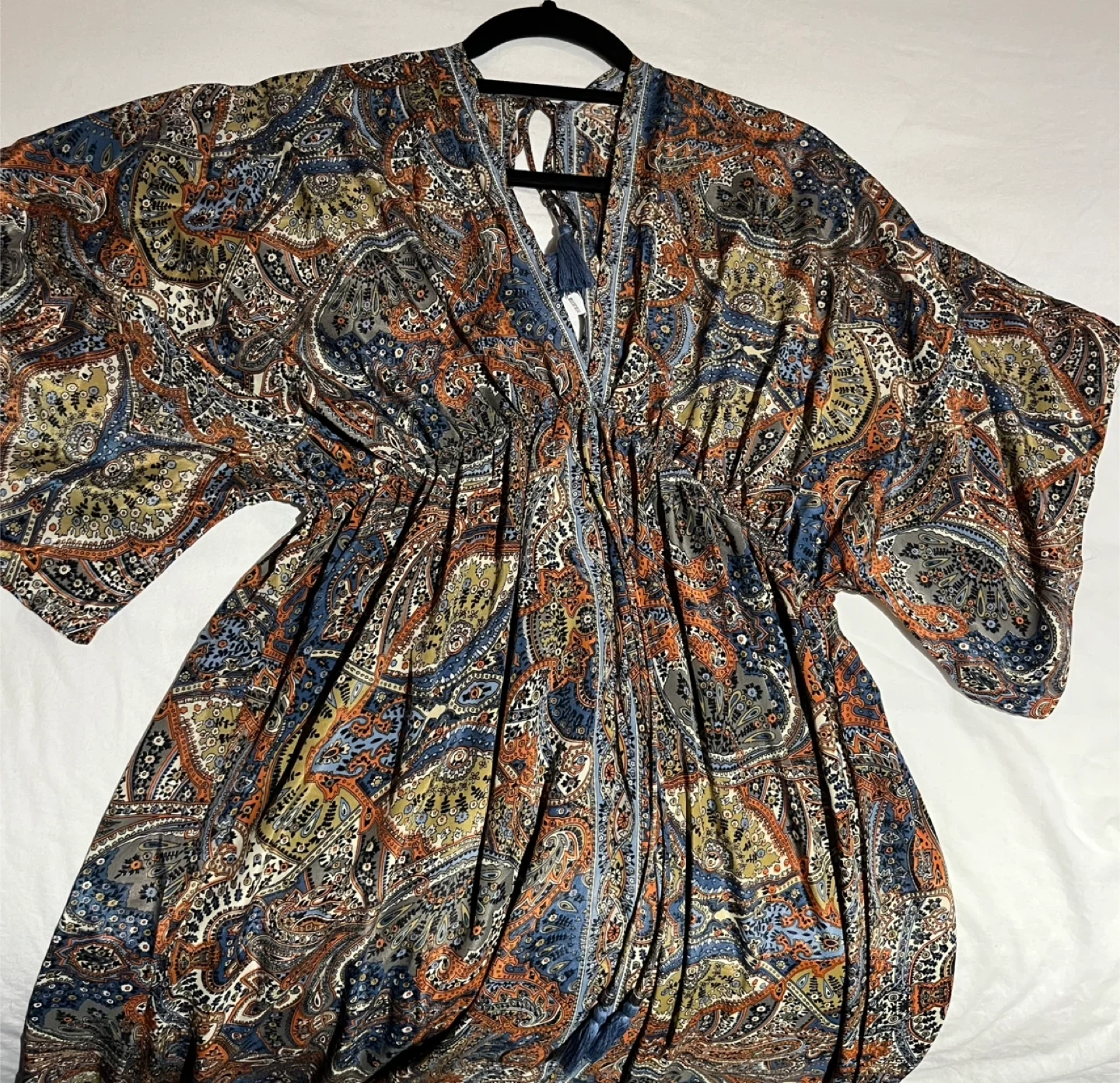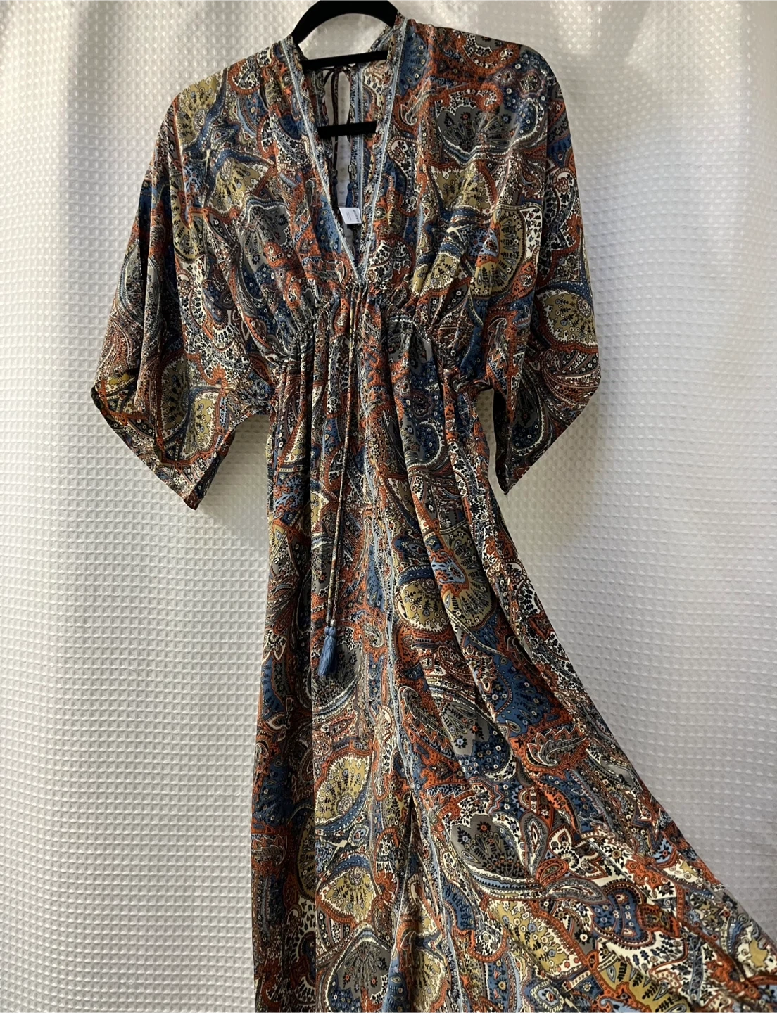 This flowy maxi dress features a vibrant paisley print with a V-neckline and cinched waist. It has wide, kimono-style sleeves and a drawstring detail with blue tassels at the neck. It's lightweight and perfect for warm weather! Material: Polyester blend.