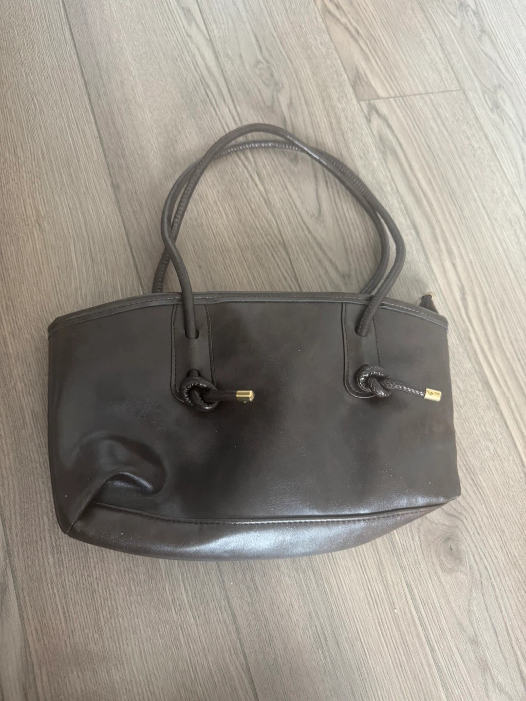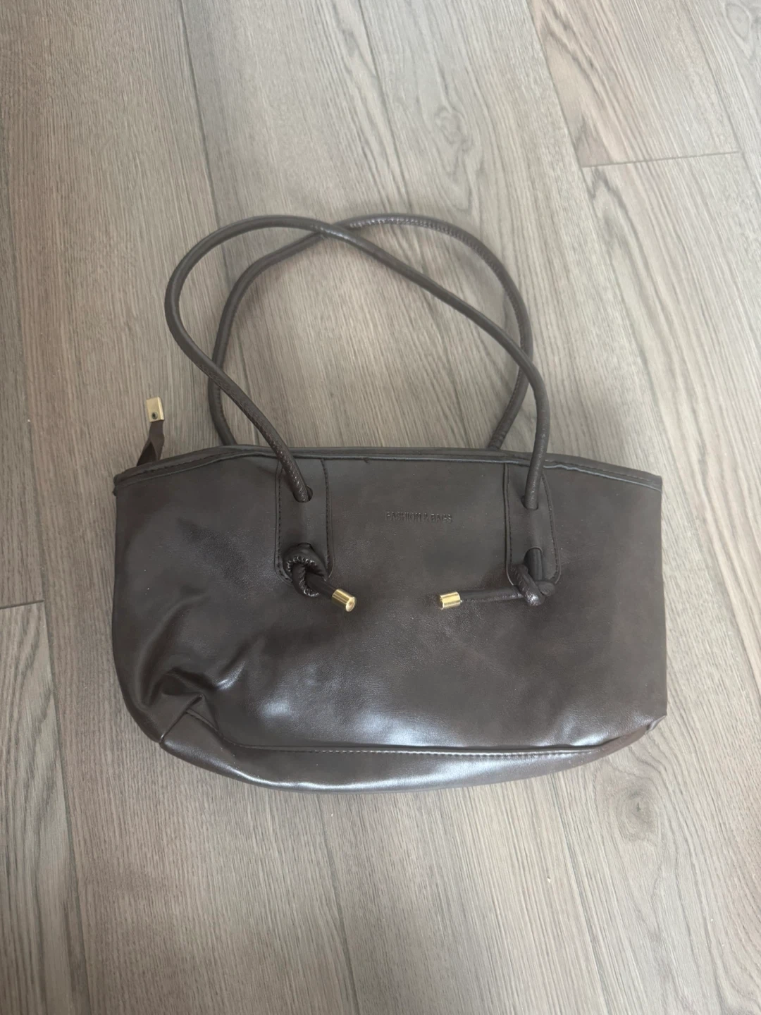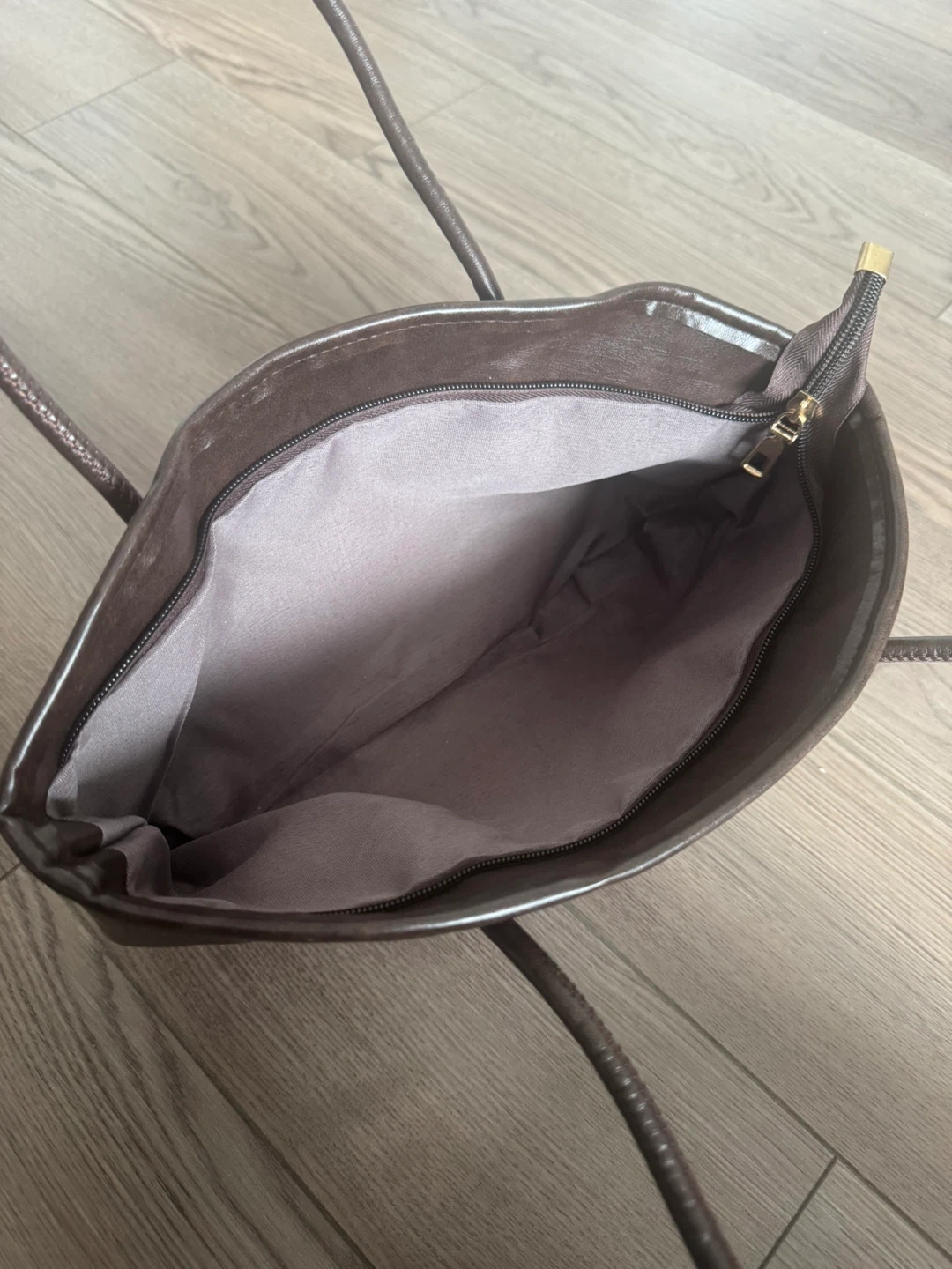 A stylish brown tote bag with a faux leather finish. It features a zippered closure and braided handles. The interior is lined with fabric.