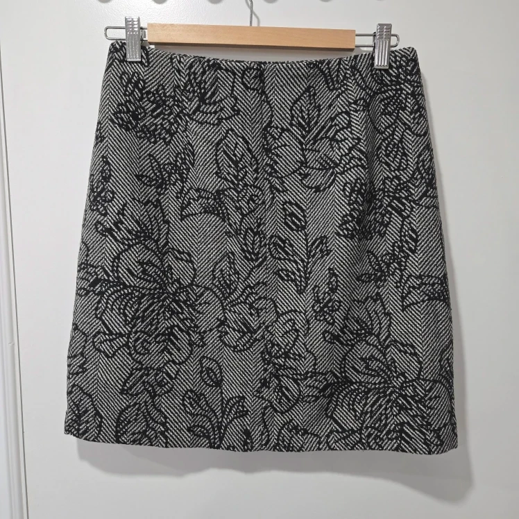Grey chevron skirt with large floral overlay. Thick wool blend material. Mini skirt. Zips up the back.