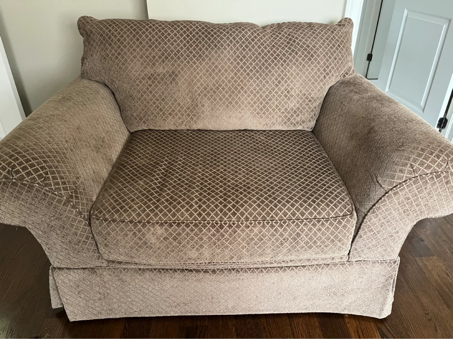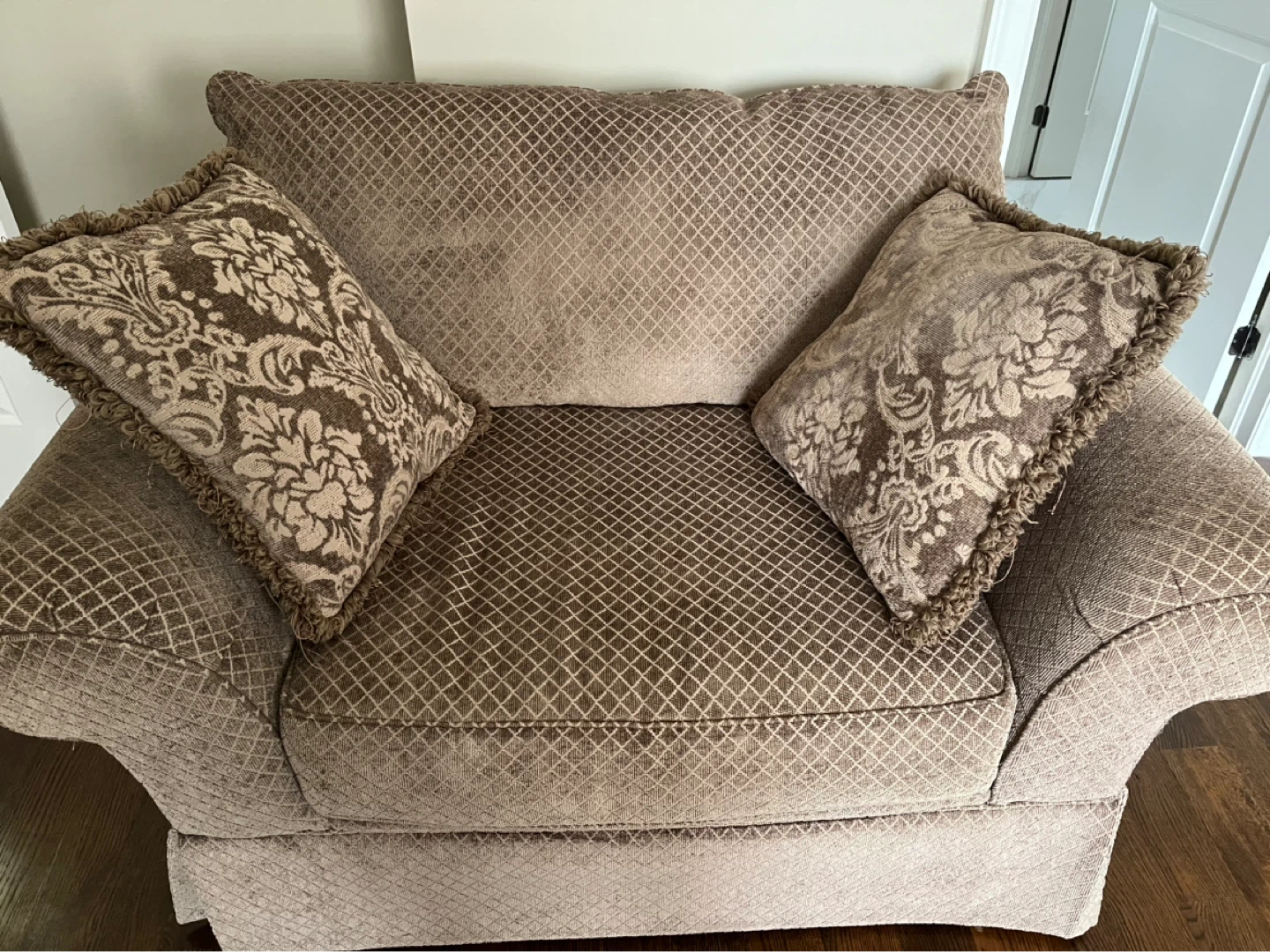 Spacious upholstered arm chair with 2 matching reversible print cushions.