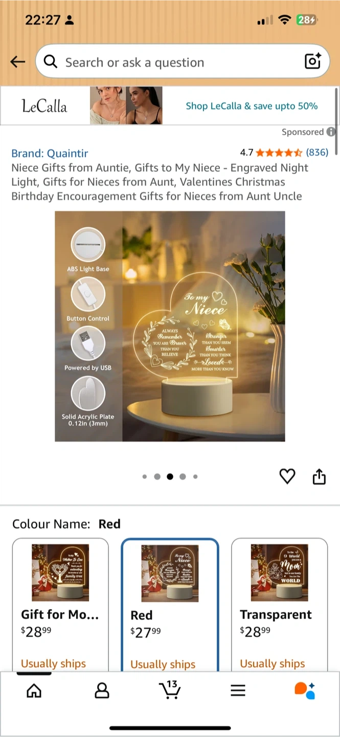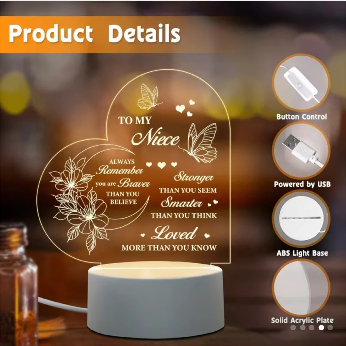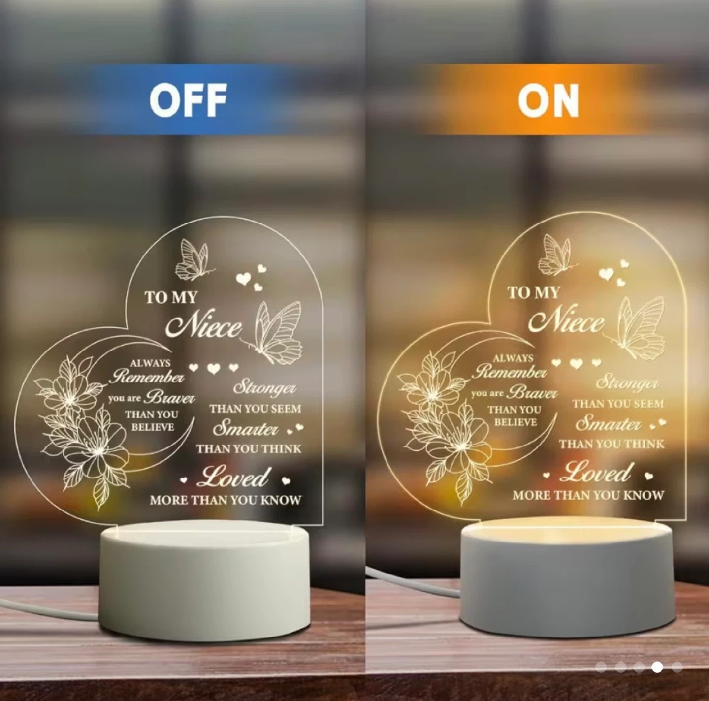This heart-shaped night light is designed for a niece. It features encouraging messages like 'Always remember you are braver than you believe, stronger than you seem, smarter than you think, and loved more than you know'. It's powered by USB with an ABS light base and a solid acrylic plate. Button control included.