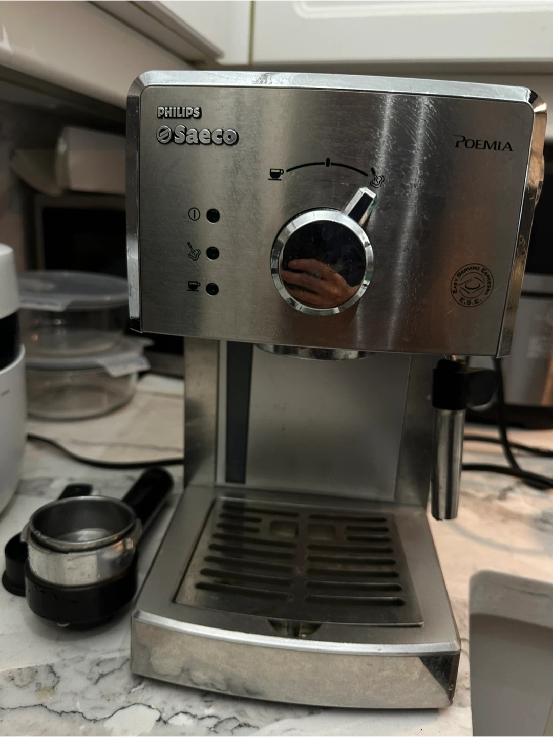 Selling a Philips Saeco Poemia espresso machine. It's in good used condition and ready to make some delicious espresso at home! Includes the portafilter and coffee scoop