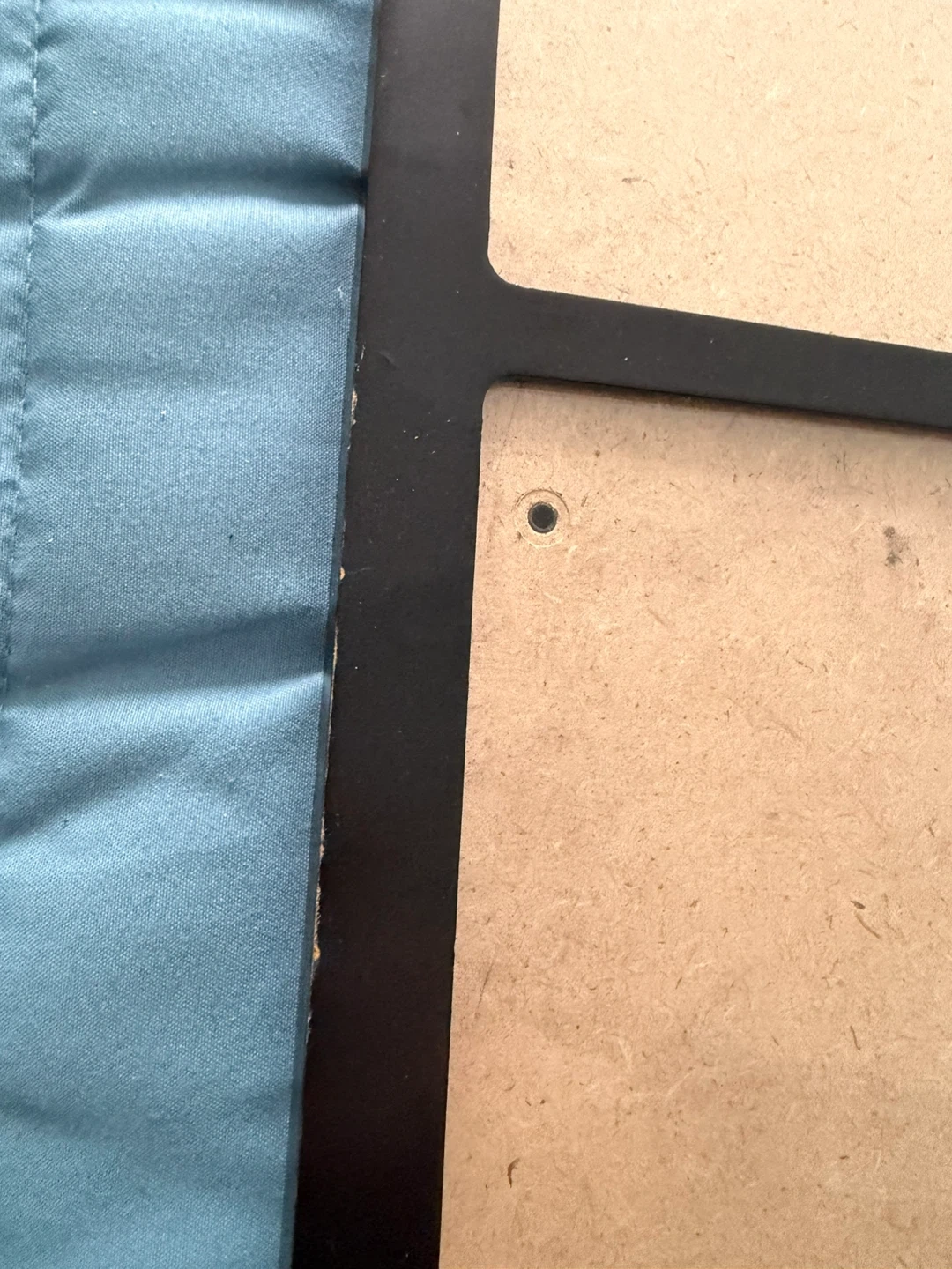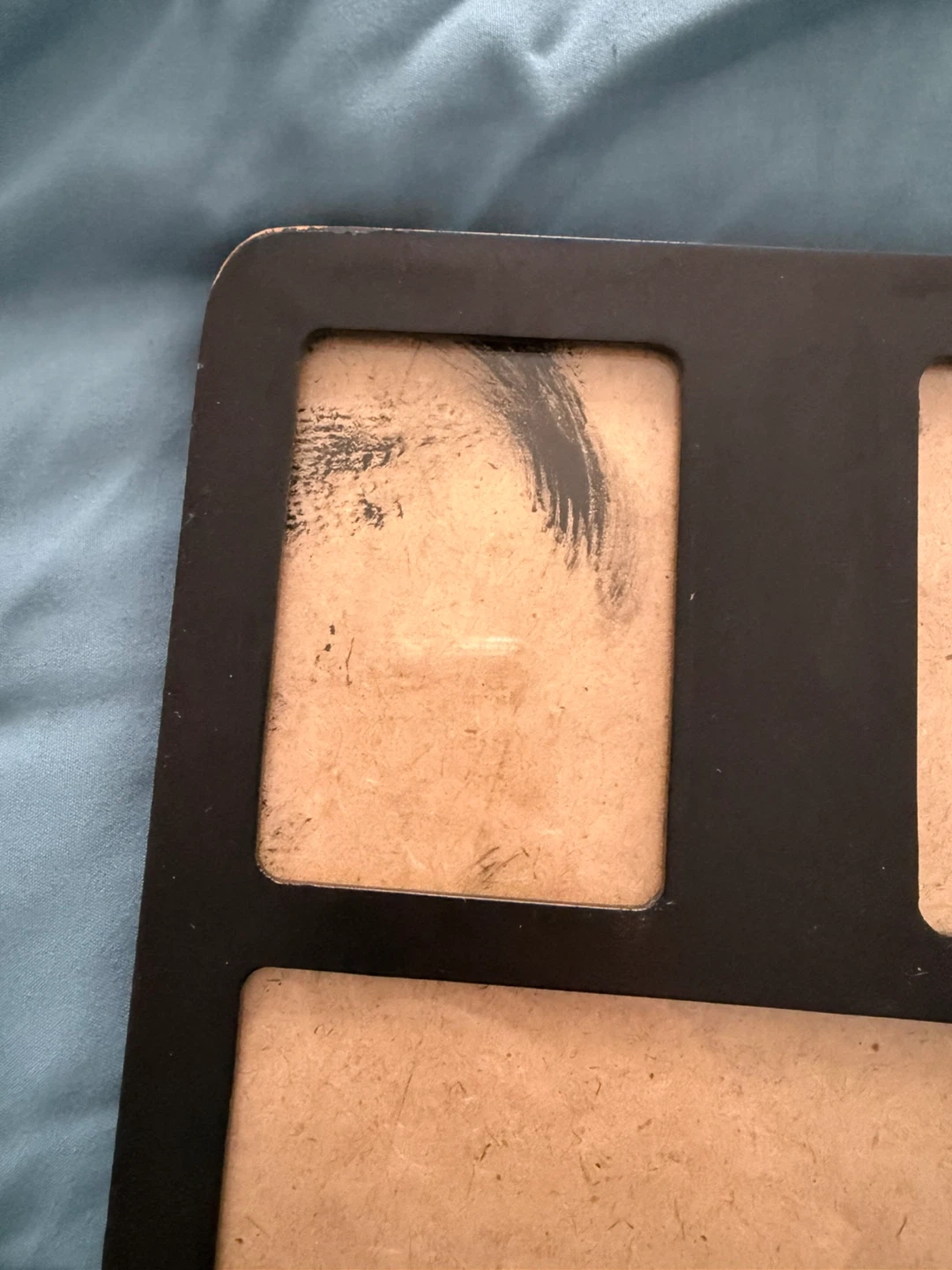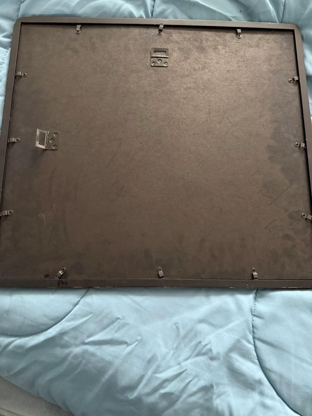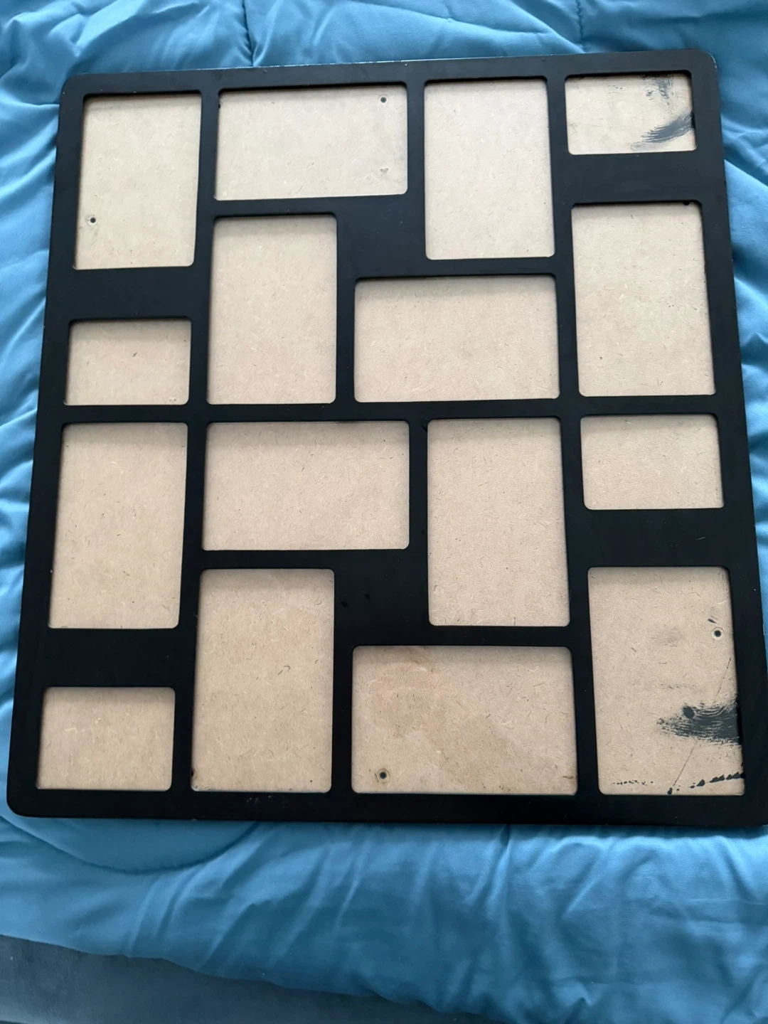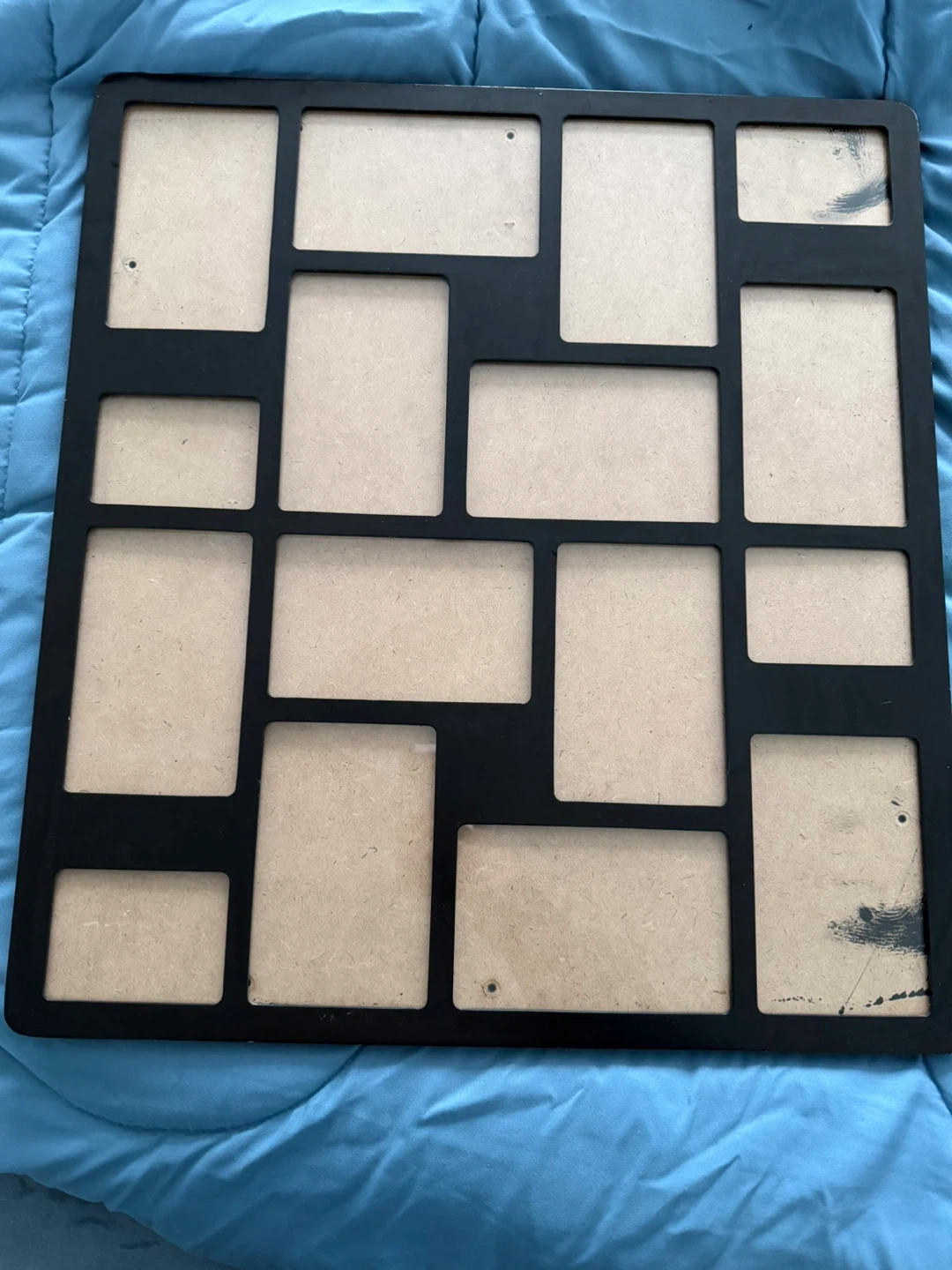 Black multi-photo frame, with glass panel and spaces for 16 photos (4x6 and 3.5 x 2.5 photos). Some wear along some of the edges as shown, though not super visible when hung- or can be repainted in any colour. Arrange & tape photos on the inside for display. The whole frame is 19” x 21” and can be hung vertically or horizontally.