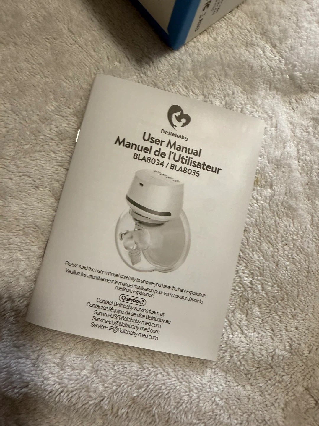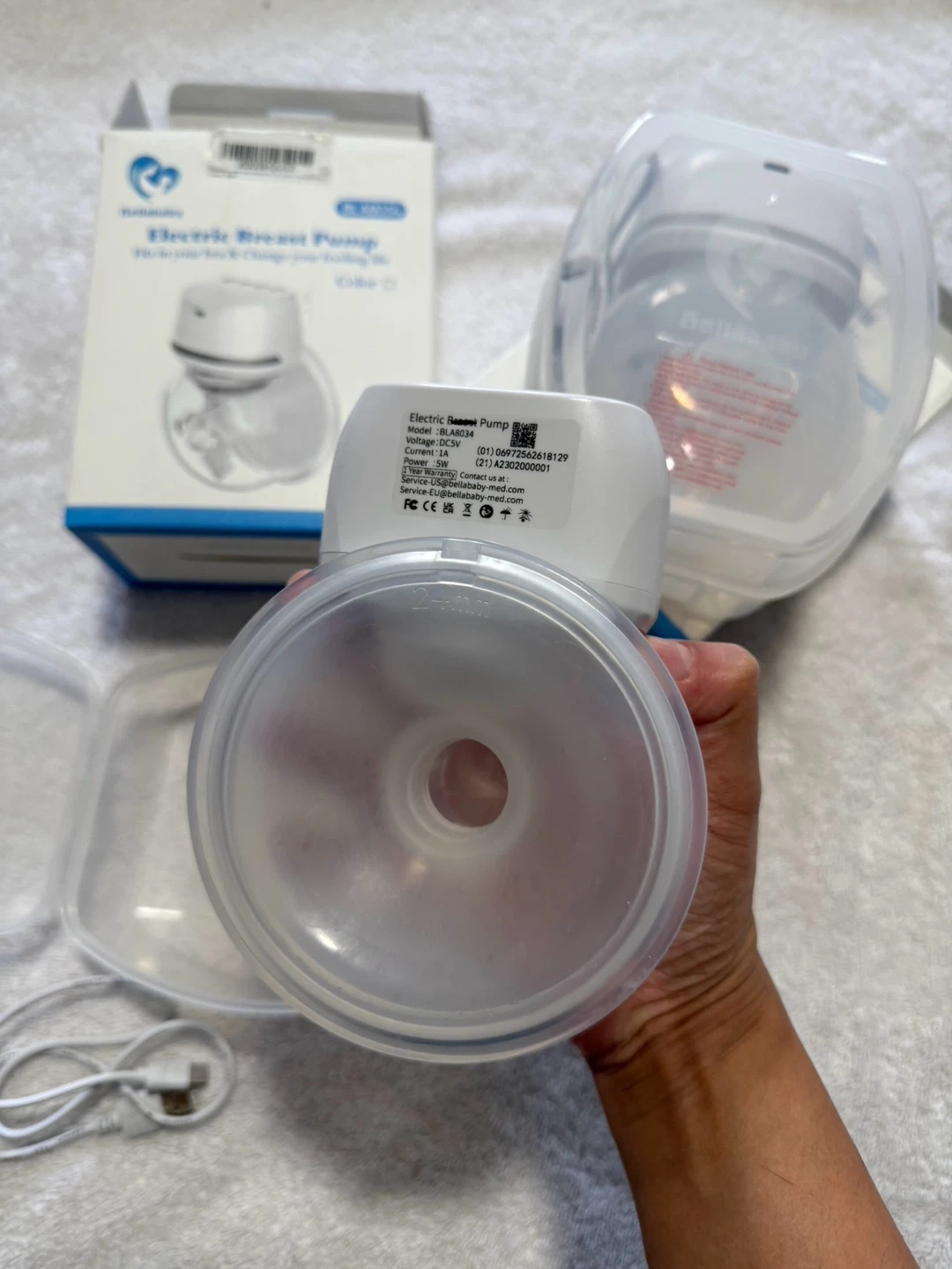 Bellababy Electric Breast Pump, model BLA8034. This pump is rechargeable and comes with a USB charging cable. It's designed for efficient and comfortable milk expression. Includes original box and user manual.