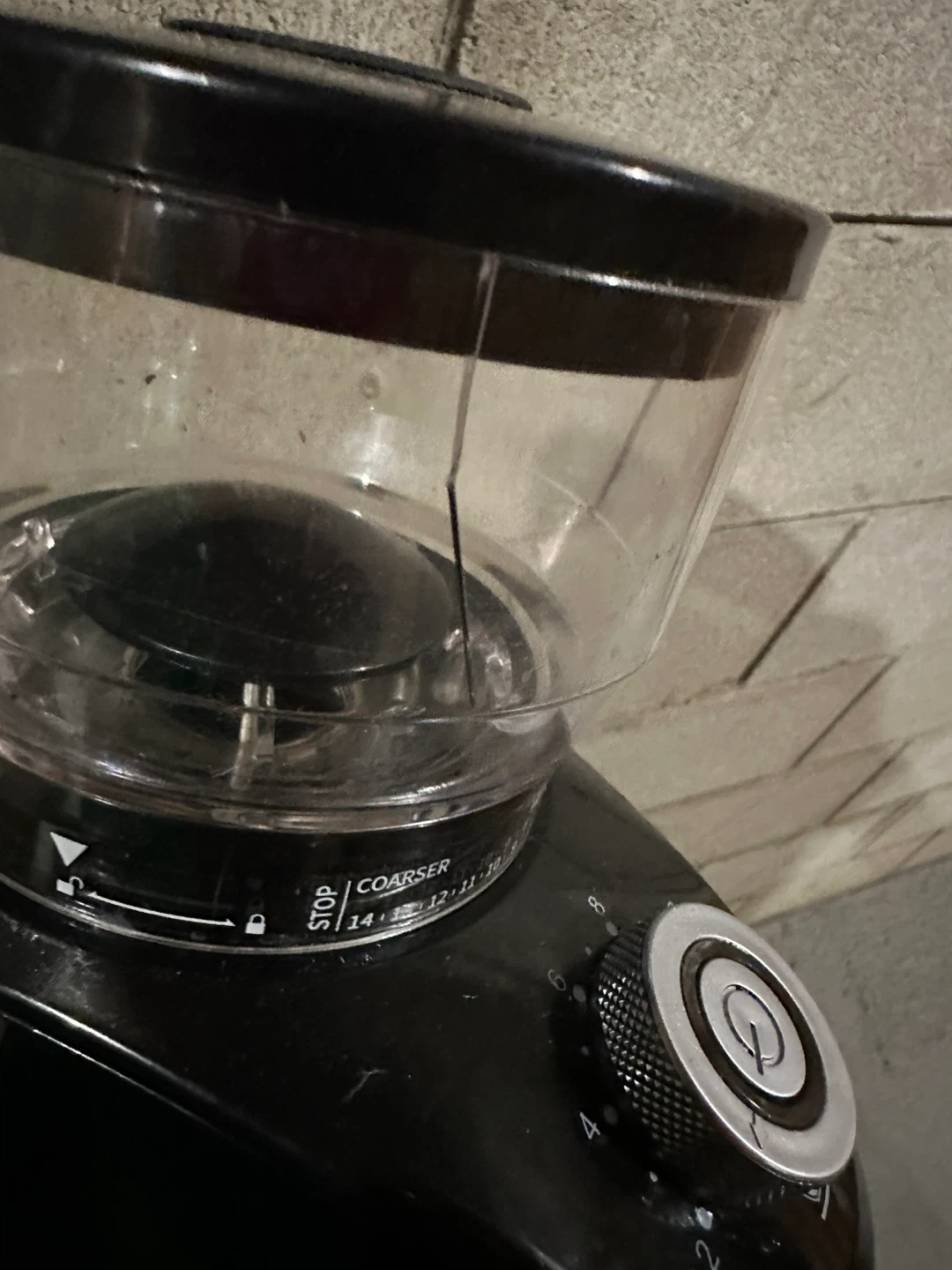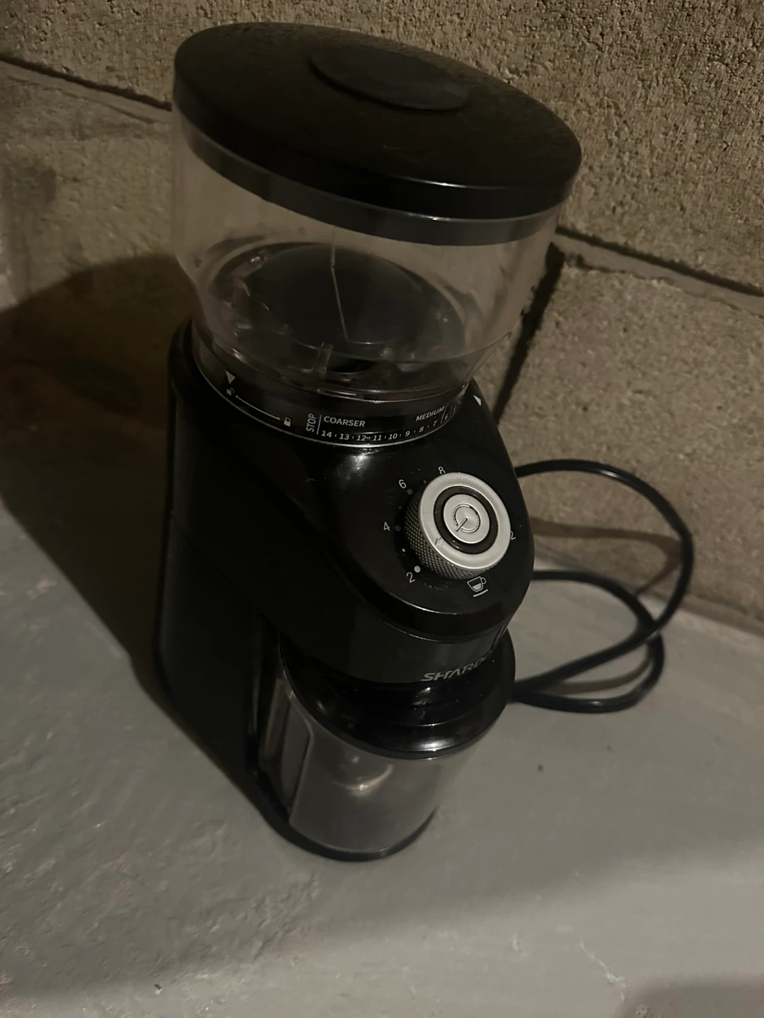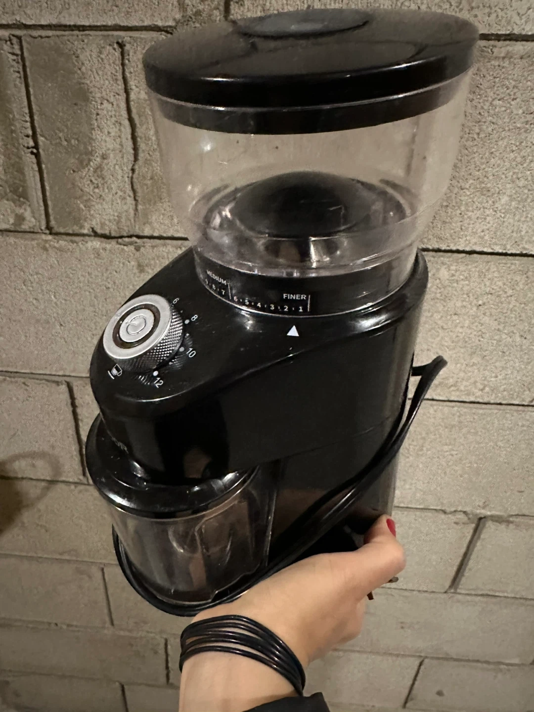 Electric coffee grinder with adjustable grind settings from coarse to fine. It has a removable container for ground coffee and a capacity for beans in the top hopper. Perfect for freshly ground coffee at home!