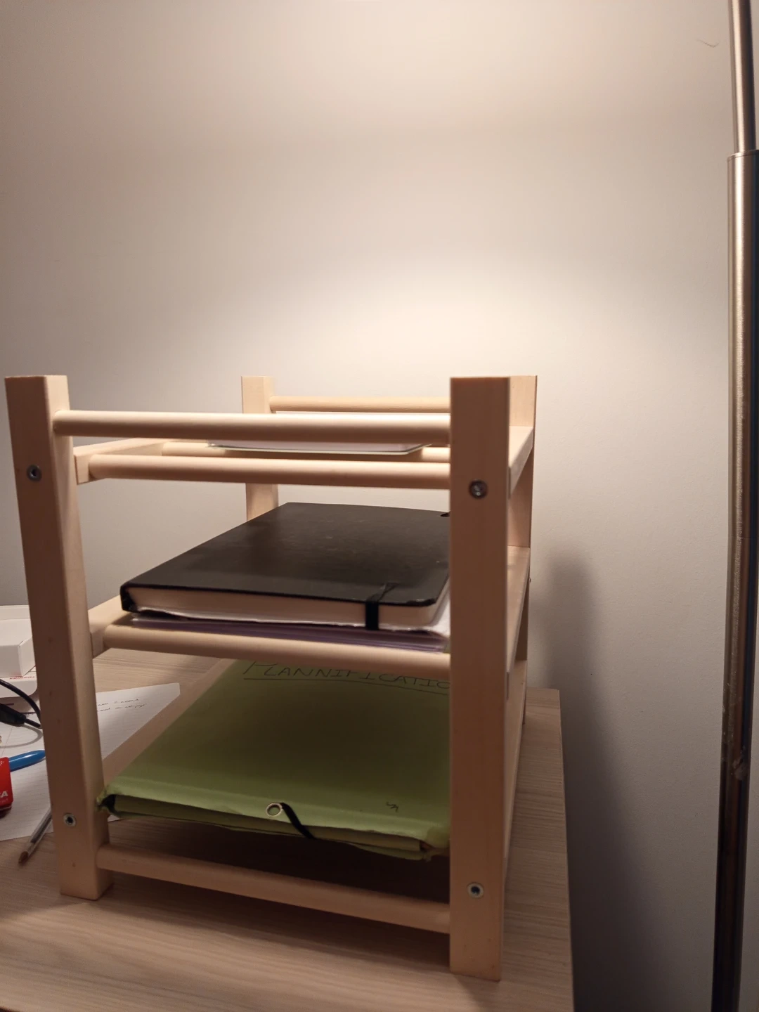 This is a simple 3-tier wooden shelf unit, perfect for organizing your desk or tabletop. It's made of light-coloured wood and has a natural finish. Useful for storing notebooks, files, and other office supplies.