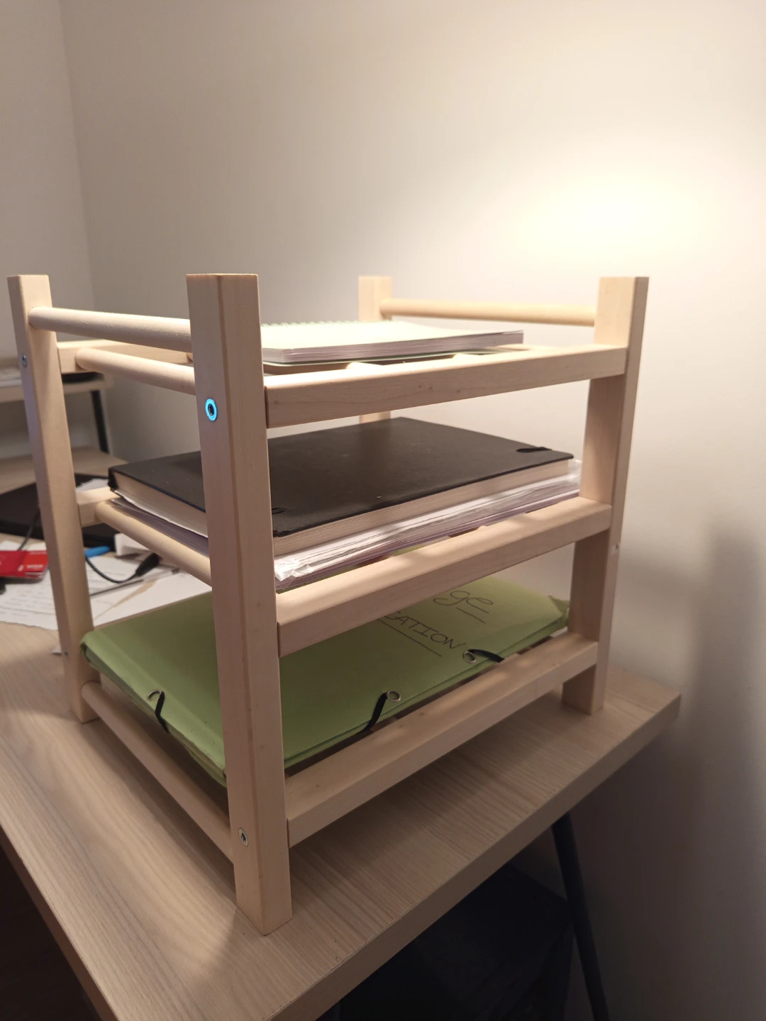 This is a simple 3-tier wooden shelf unit, perfect for organizing your desk or tabletop. It's made of light-coloured wood and has a natural finish. Useful for storing notebooks, files, and other office supplies.