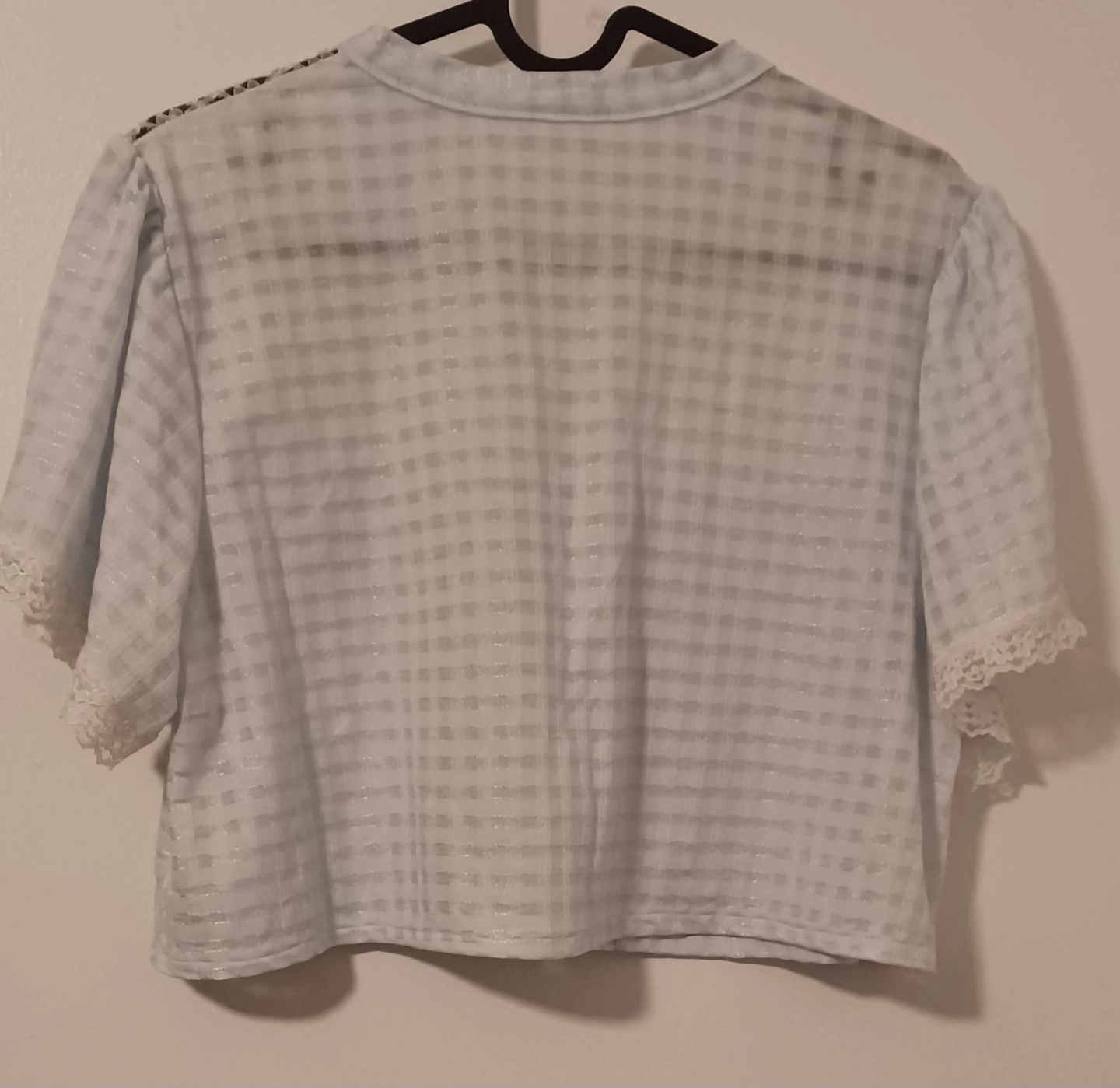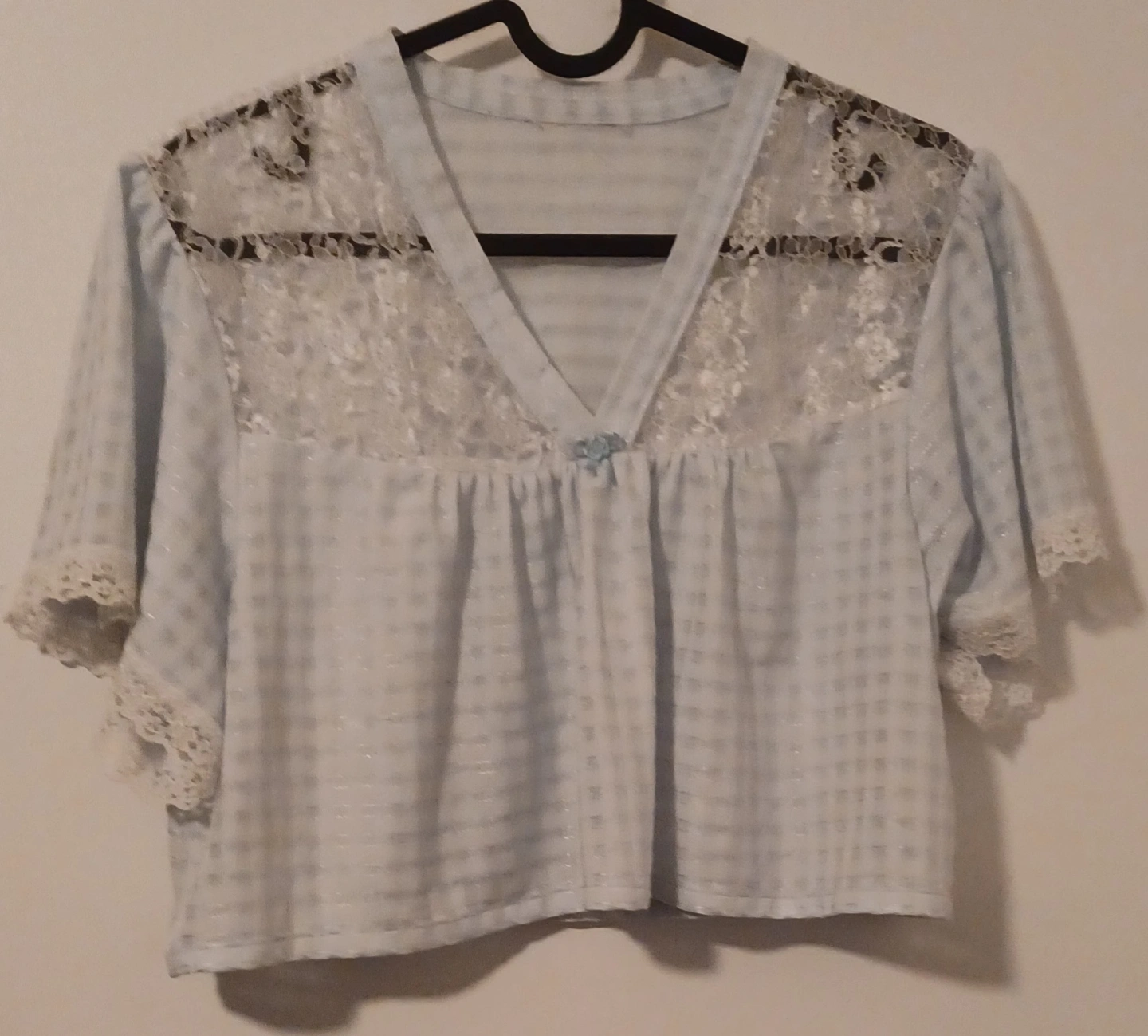 Adorable vintage crop top. Light blue gingham fabric. Short sleeves. Lace detailing on the neckline and sleeves. Button closure at the front. Rad-cycled from old night gown! 💫♻️✨️ Wear it as a top or as pj's! super comfy 🌛