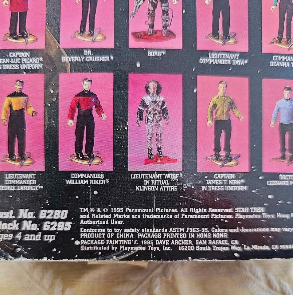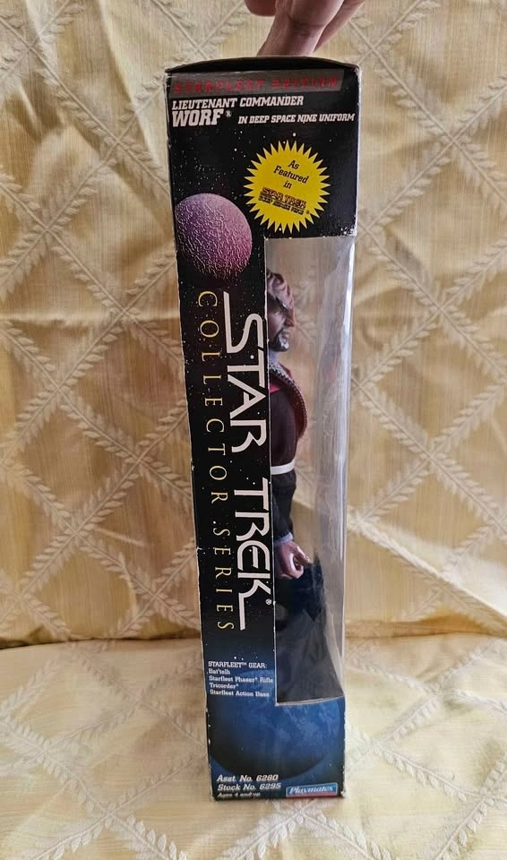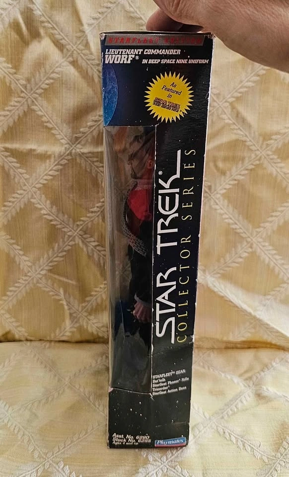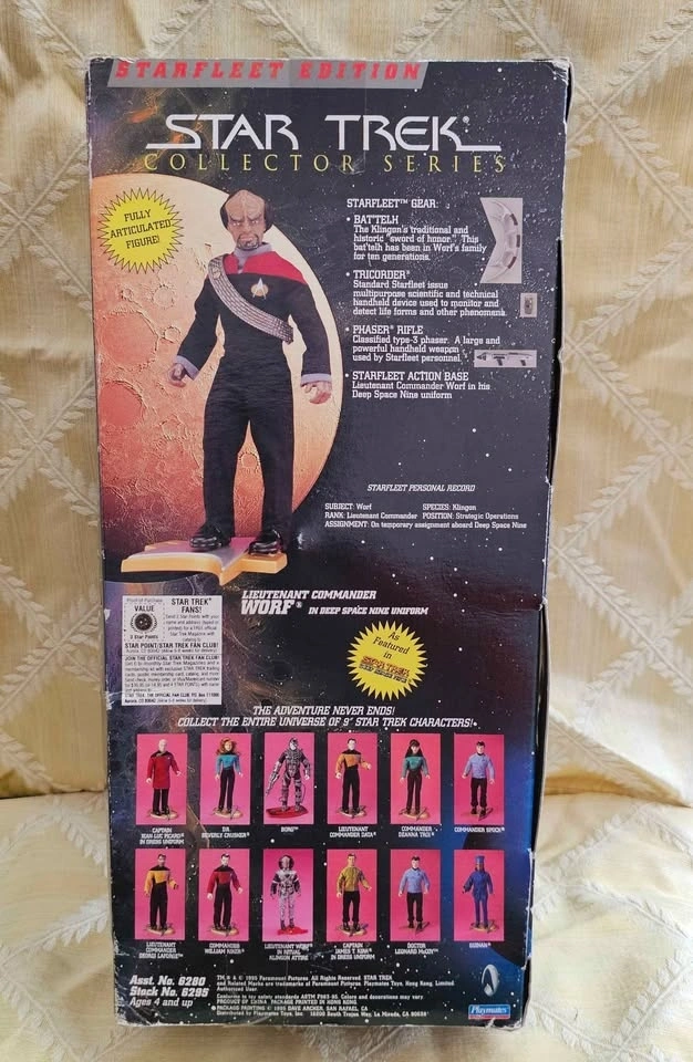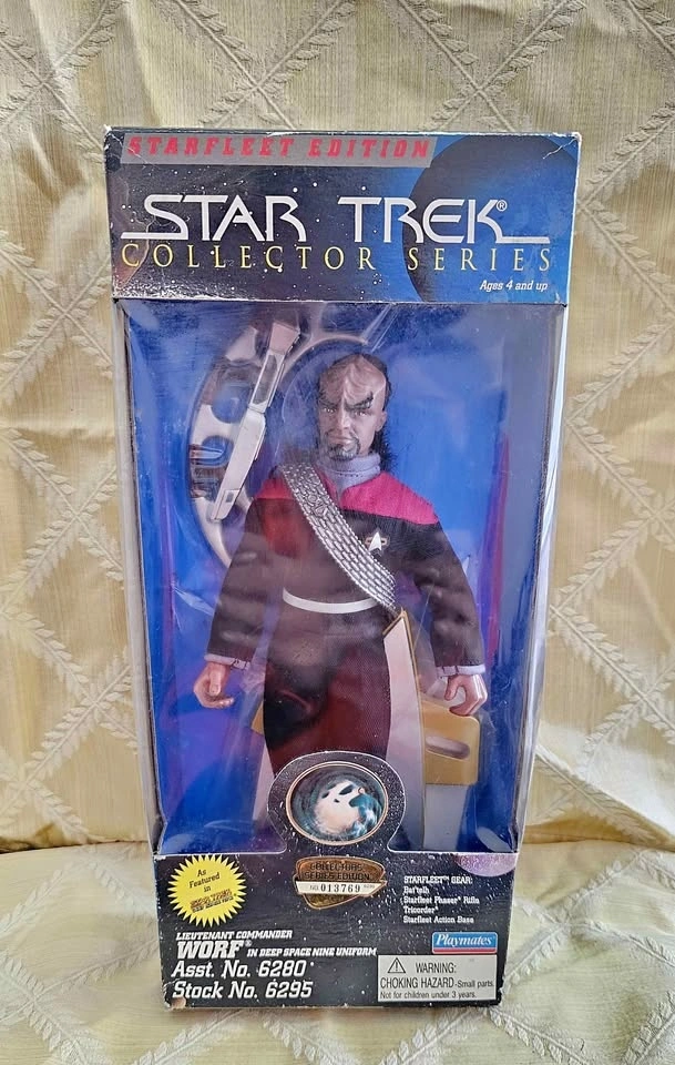 Awesome Star Trek Worf 9" action figure from Playmates Collector Series. Lieutenant Commander Worf is in his Deep Space Nine uniform. This figure is new in box and has never been opened. The box has some shelf wear on the edges and corners. He comes with his Bat'leth, Phaser Rifle, Tricorder, and action base. Pick up from a smoke-free home in the McKenzie Lake Douglasdale area in SE Calgary.