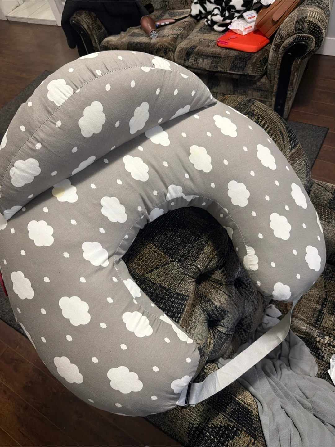 This is a U-shaped nursing pillow designed for comfort during feeding. It features a removable gray cover with a white cloud pattern. The pillow has a zipper closure for easy cleaning. A strap with a buckle is included for added support. This pillow is great for providing support to both parent and baby.