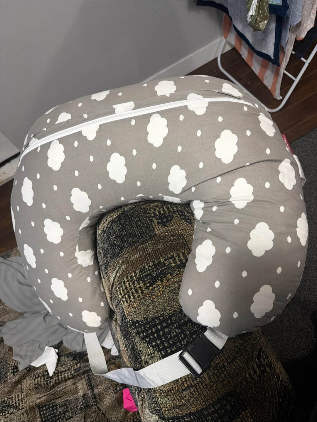 This is a U-shaped nursing pillow designed for comfort during feeding. It features a removable gray cover with a white cloud pattern. The pillow has a zipper closure for easy cleaning. A strap with a buckle is included for added support. This pillow is great for providing support to both parent and baby.