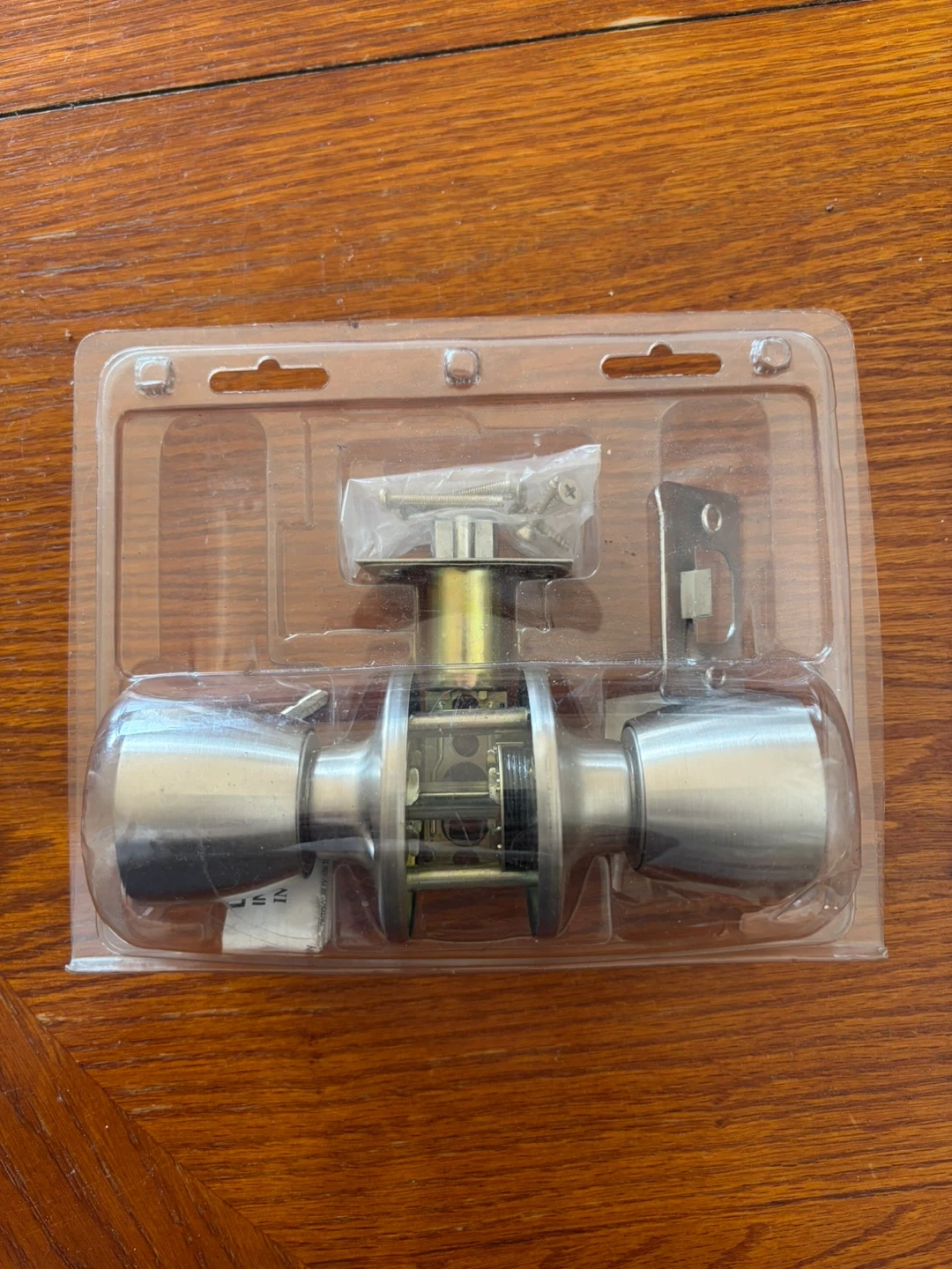 This is a new, in-package stainless steel door knob set. It includes all the necessary hardware for installation. It's a classic design for any interior door.