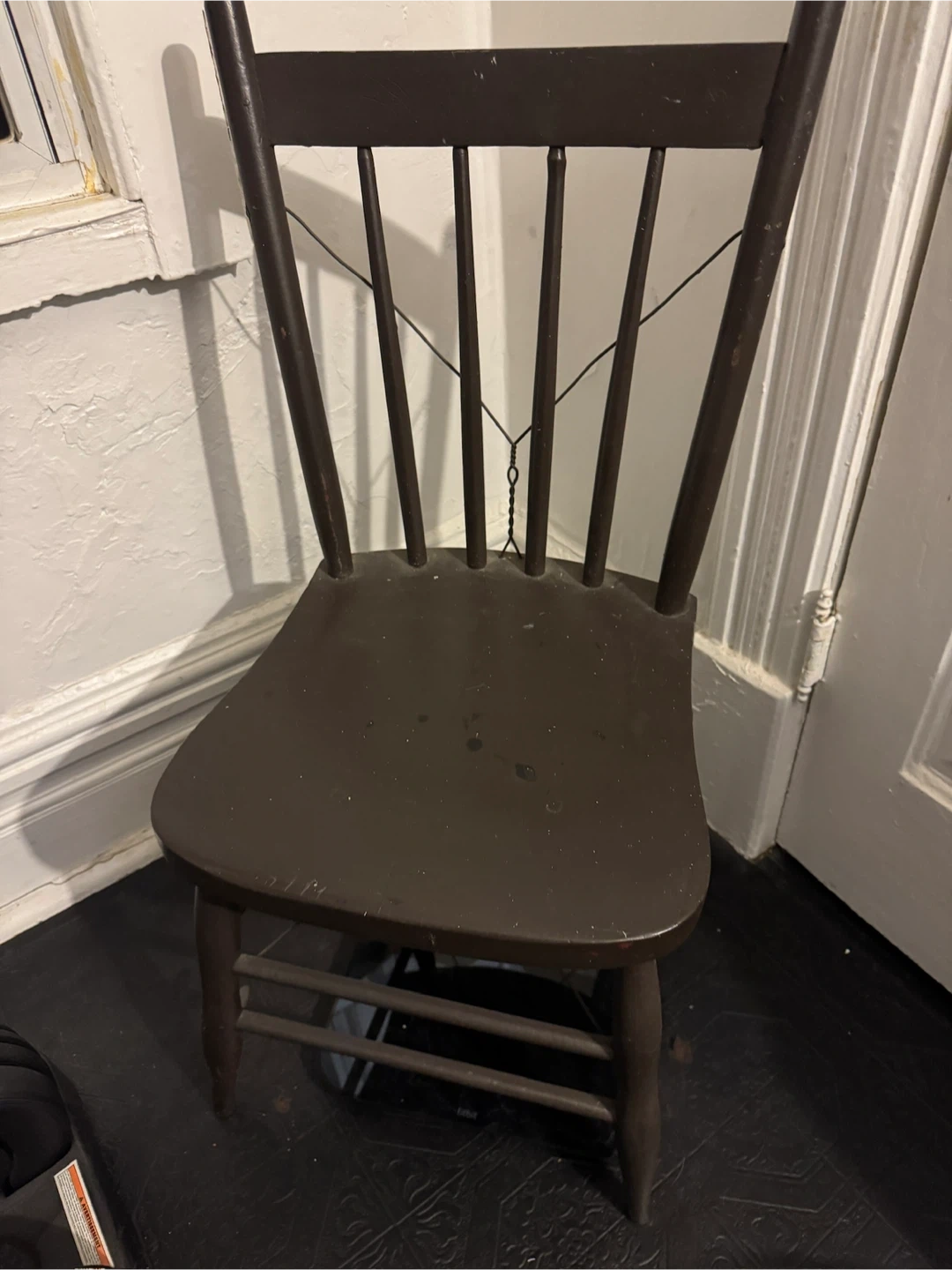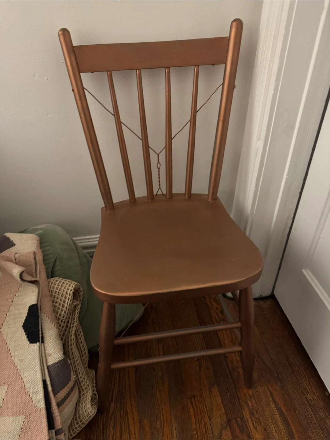 2 classic wooden chairs with a spindle back design. One painted rose gold, the other painted dark brown. It features a comfortable seat and sturdy legs. This chair's timeless design makes it a great addition to any room.