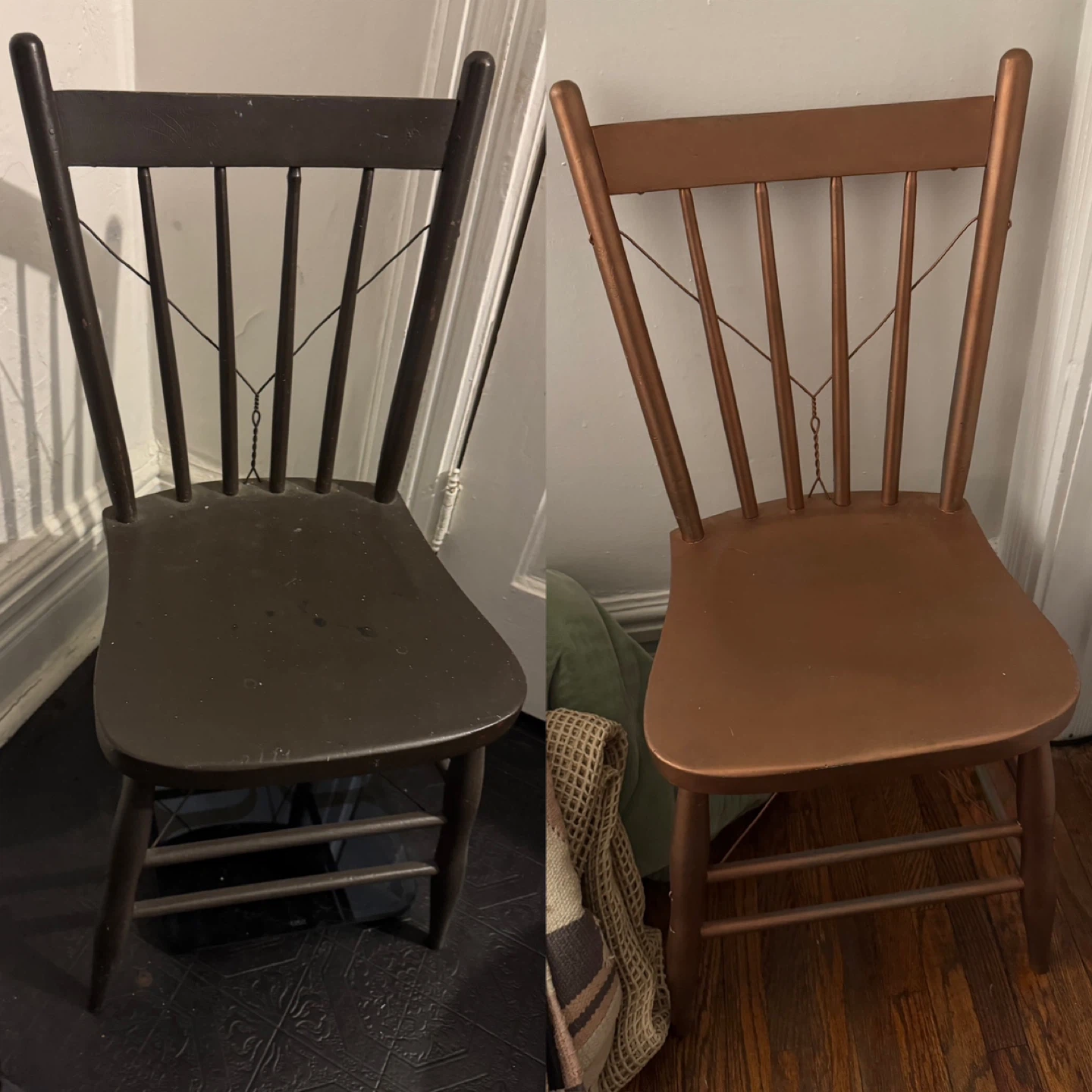 2 classic wooden chairs with a spindle back design. One painted rose gold, the other painted dark brown. It features a comfortable seat and sturdy legs. This chair's timeless design makes it a great addition to any room.