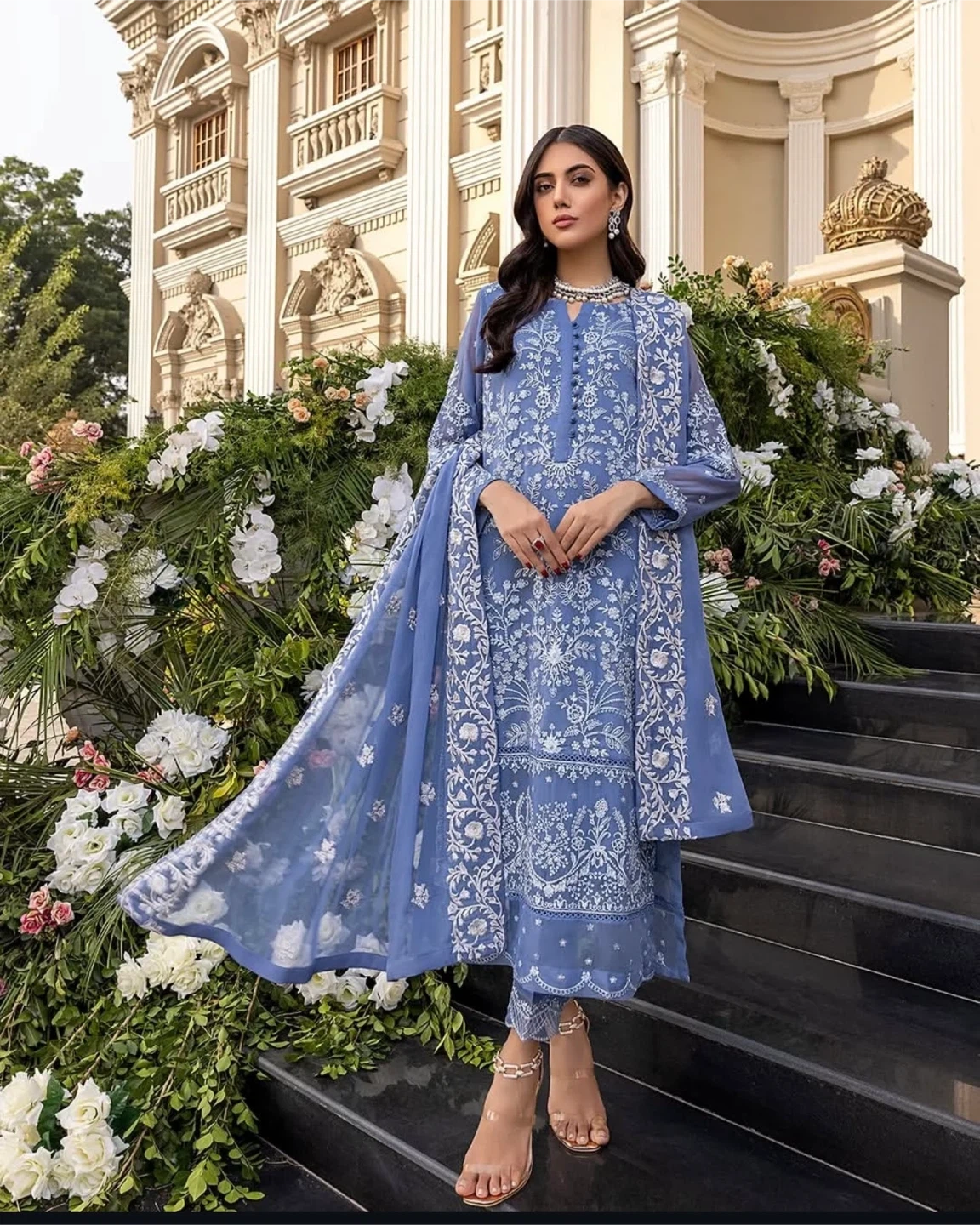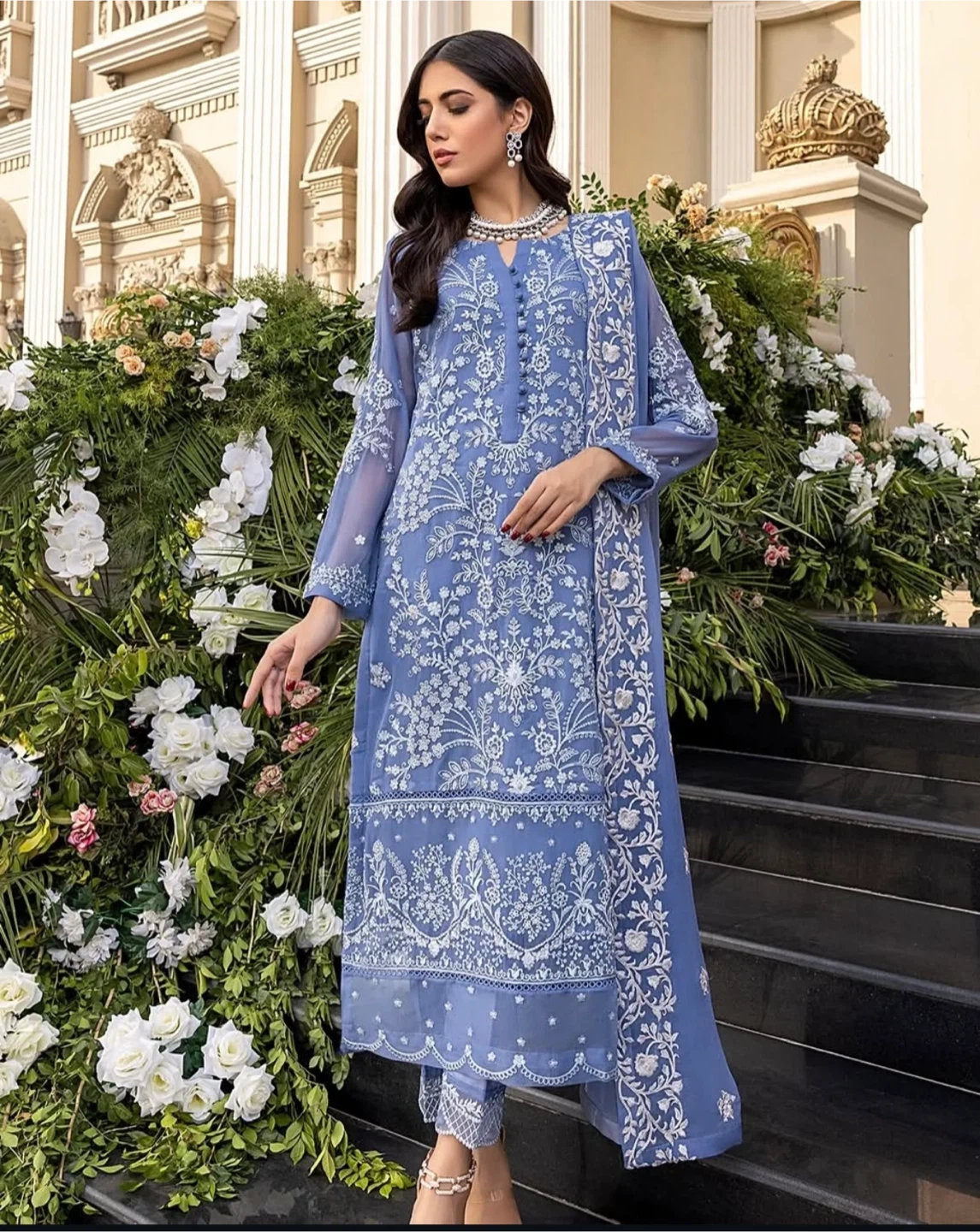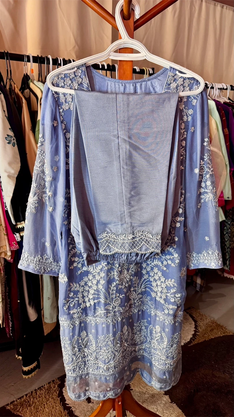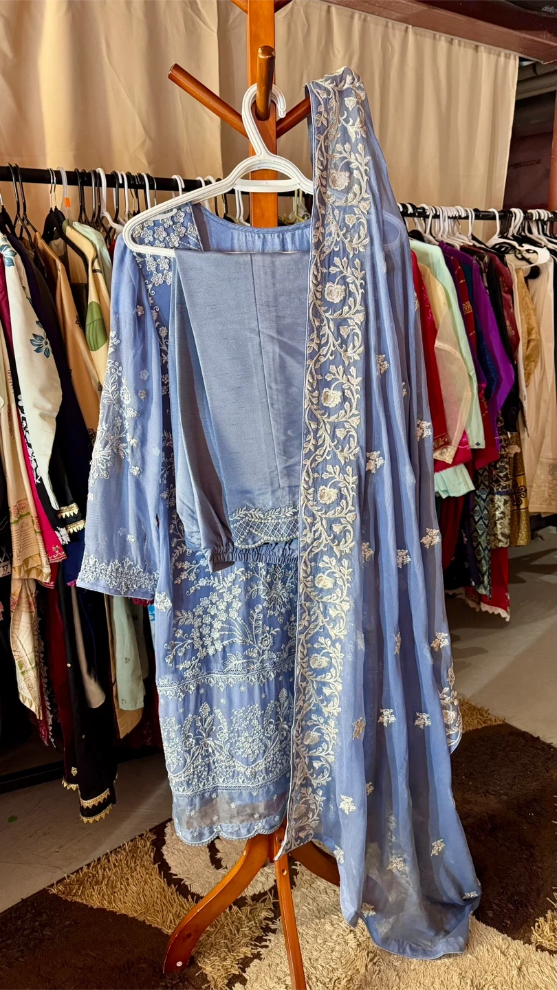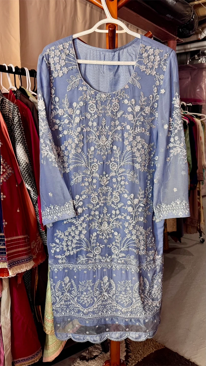 Selling a beautiful ladies' shalwar kameez suit in a lovely shade of blue. It features delicate white embroidery throughout the design. Perfect for special occasions or everyday wear!