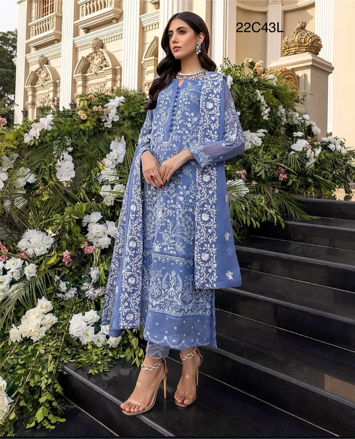 Selling a beautiful ladies' shalwar kameez suit in a lovely shade of blue. It features delicate white embroidery throughout the design. Perfect for special occasions or everyday wear!