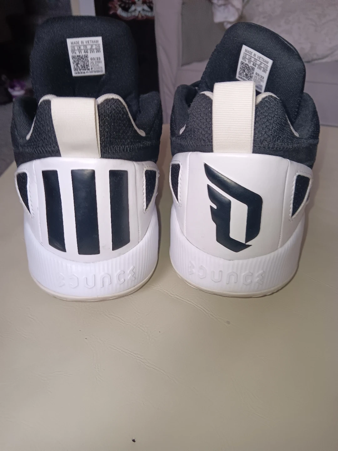 These Adidas Dame 8 basketball shoes are in a black, white, and grey colourway. They feature the "Dame Time" logo on the heel. Bounce cushioning provides comfort and support during play. Manufactured in 03/23.