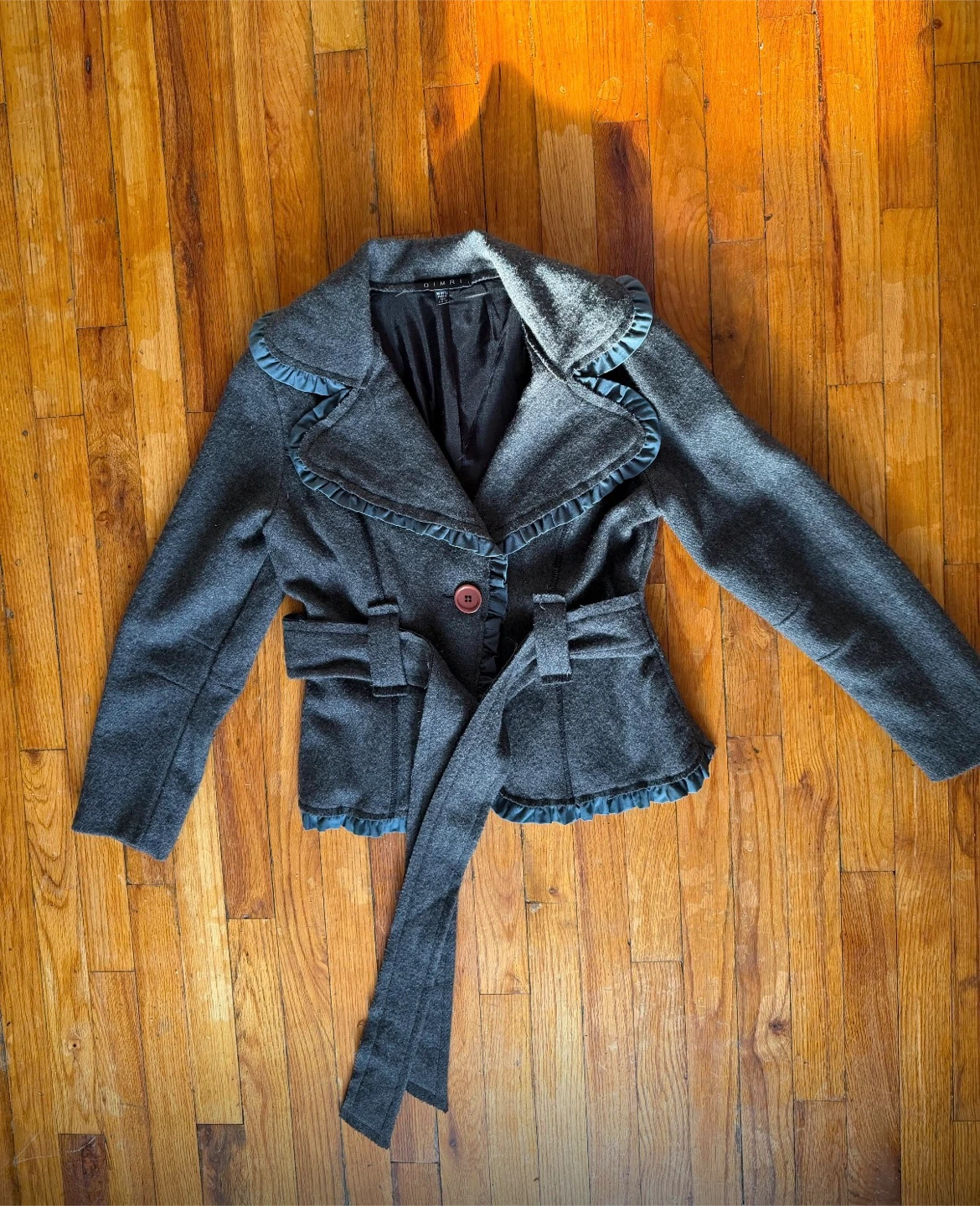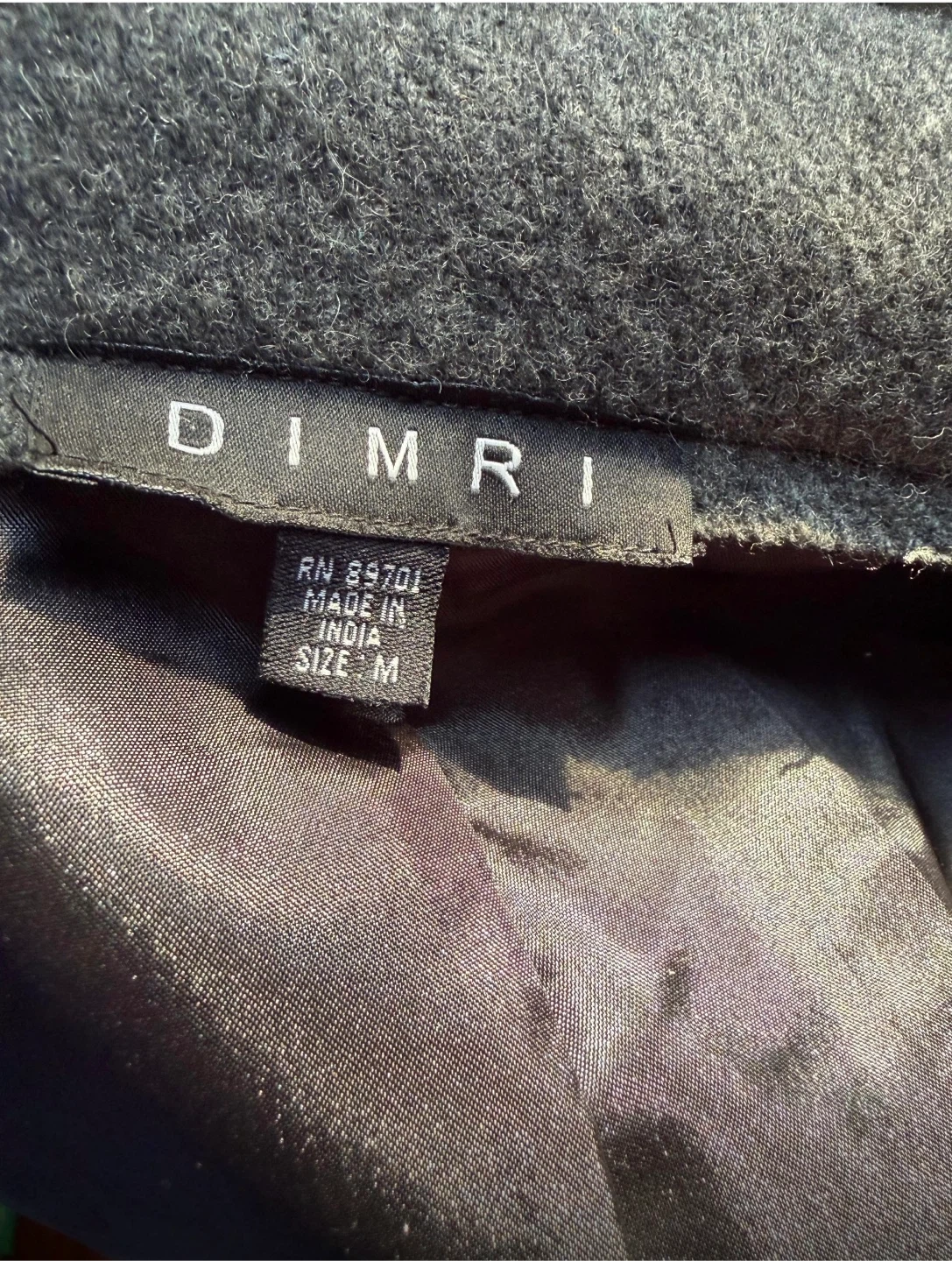 This is a stylish gray jacket from DIMRI. It's a size medium and features a flattering belted design. The jacket has decorative ruffled trim along the edges and a single button closure.