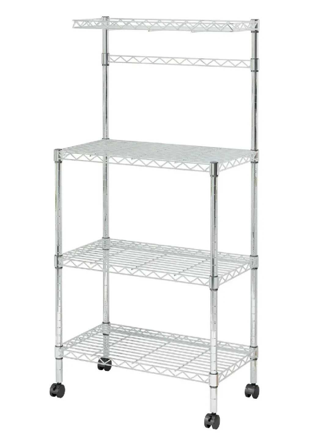 This kitchen baker's rack is perfect for adding storage and style to your kitchen or pantry. This rack features a sturdy metal frame with four tiers of shelving, providing ample space for your microwave, cookware, and other kitchen essentials. The adjustable feet ensure stability on any surface. Ready to assemble and easy to move around thanks to its rolling wheels. It would look great in any kitchen!