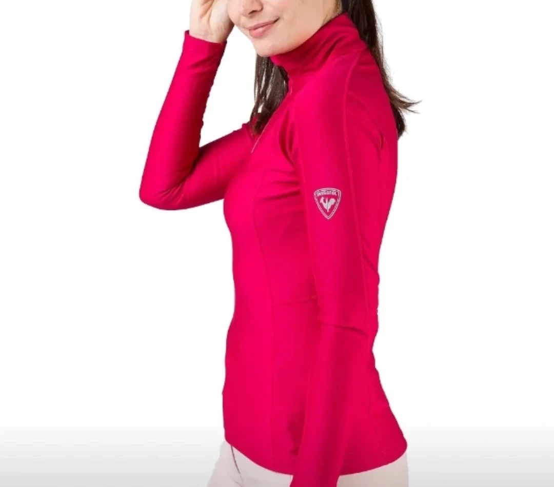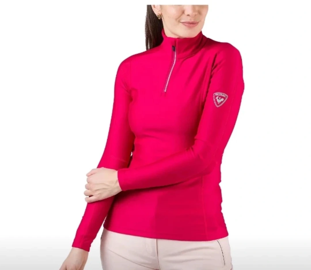 This is a women's long sleeve top by Rossignol. It's a vibrant pink colour with a quarter-zip neck. The material feels soft and stretchy.