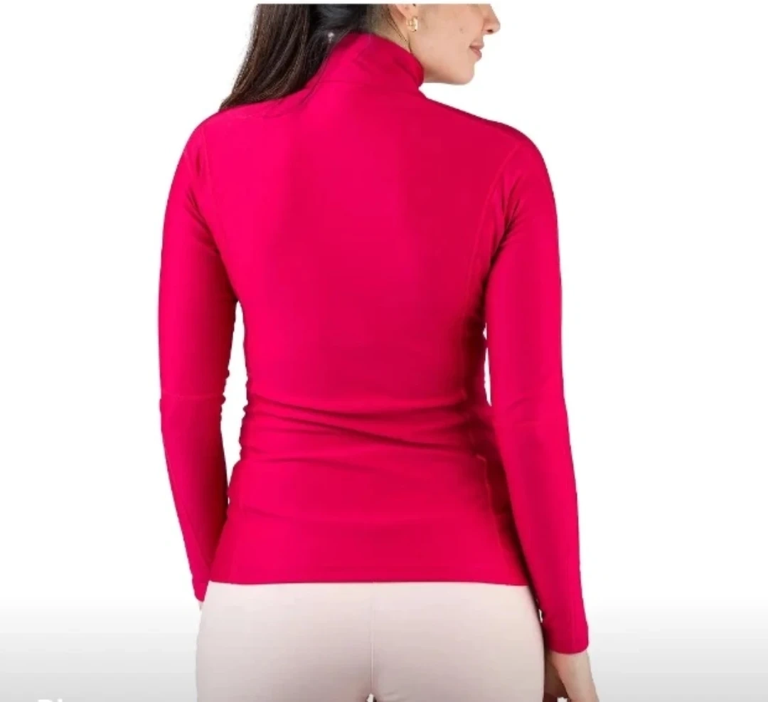 This is a women's long sleeve top by Rossignol. It's a vibrant pink colour with a quarter-zip neck. The material feels soft and stretchy.