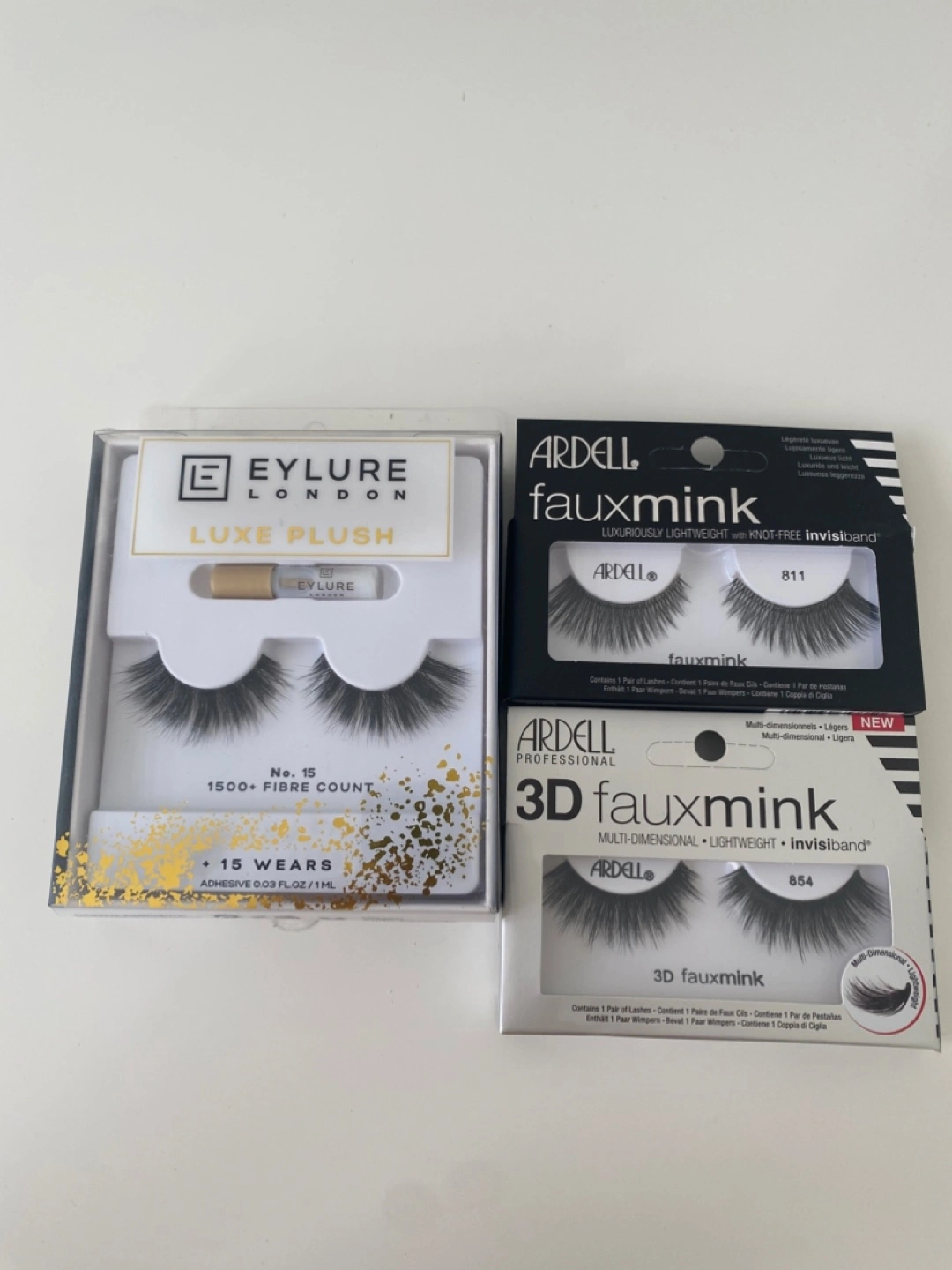 Selling a set of Eylure London Luxe Plush No. 15 lashes with 1500+ fibre count, plus two Ardell Fauxmink lash sets: one 811 and one 3D 854! They're lightweight and have knot-free invisibands.