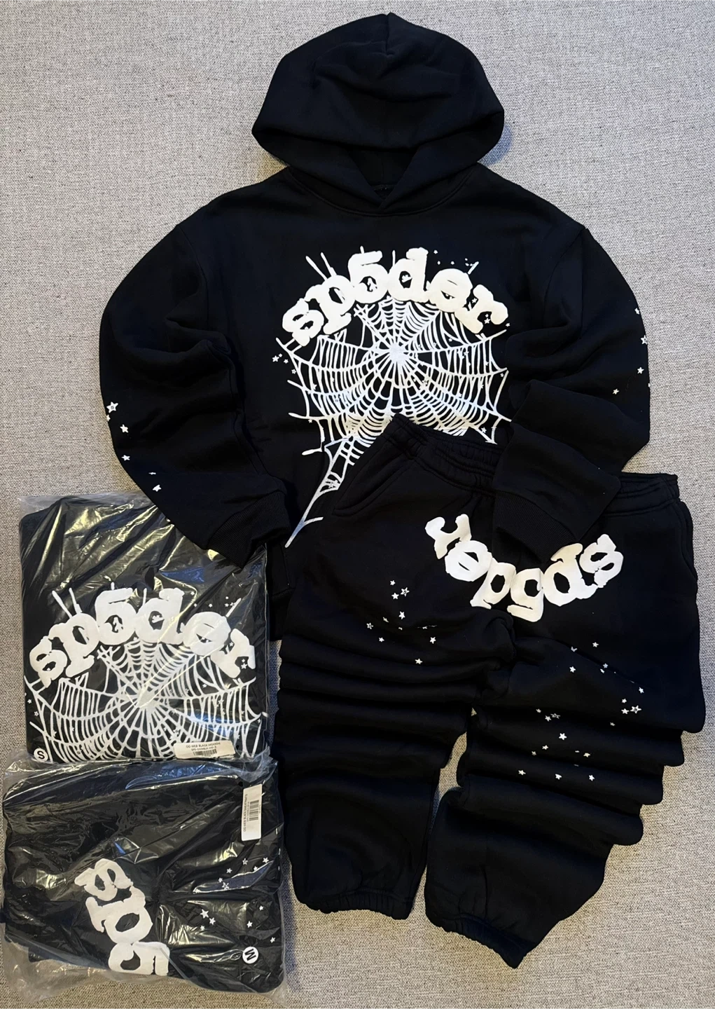 Black Spider Worldwide hoodie and sweatpants set with white web and star graphic. Hoodie features a drawstring hood and front graphic. Sweatpants have an elastic waistband and all-over star print. Both items are new with tags.
