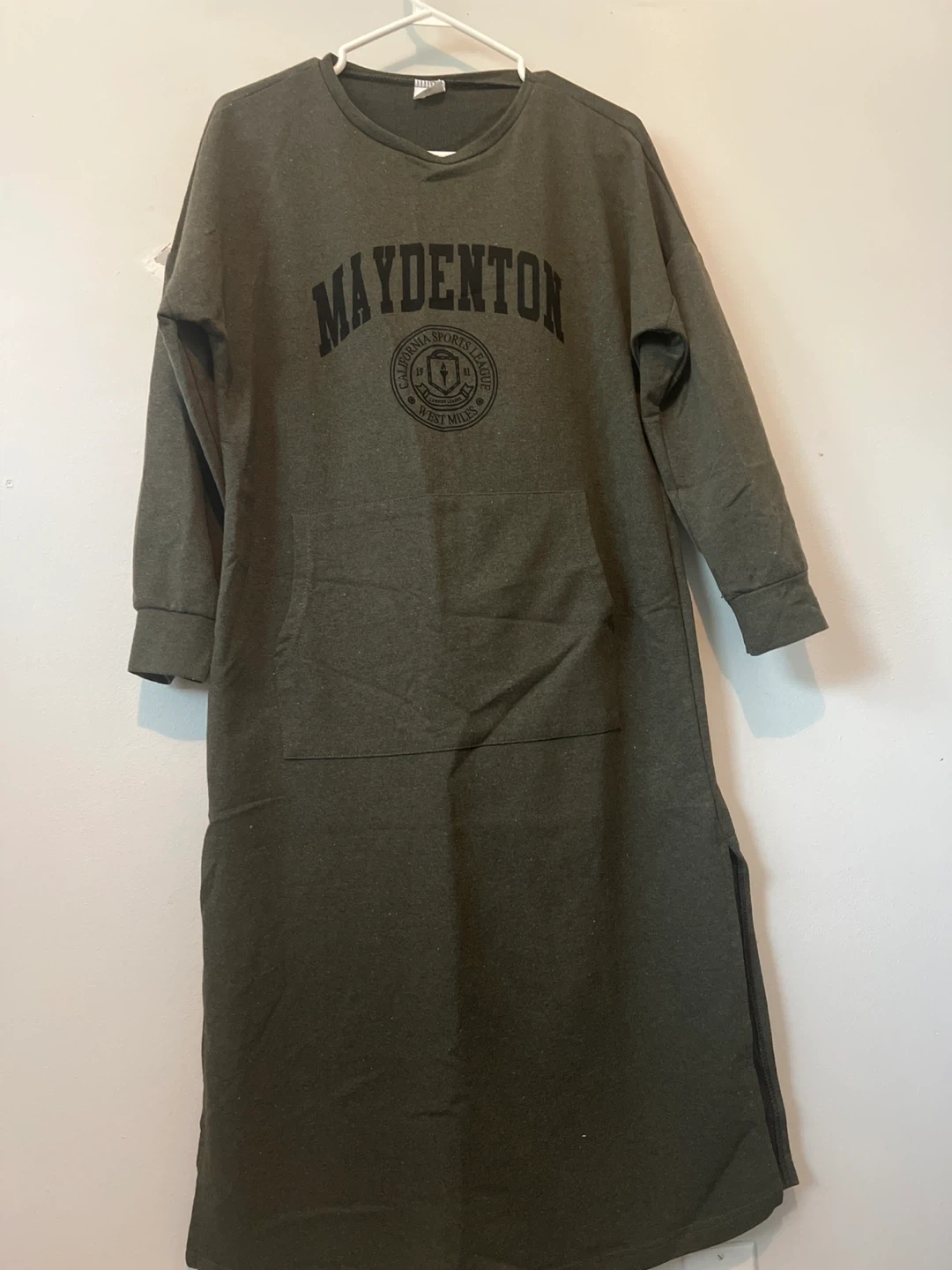 Olive green long-sleeved dress with 'Maydenton California Sports League West Miles' graphic. It features a kangaroo pocket and side slits. Modest, very cozy. Brand new, never worn.