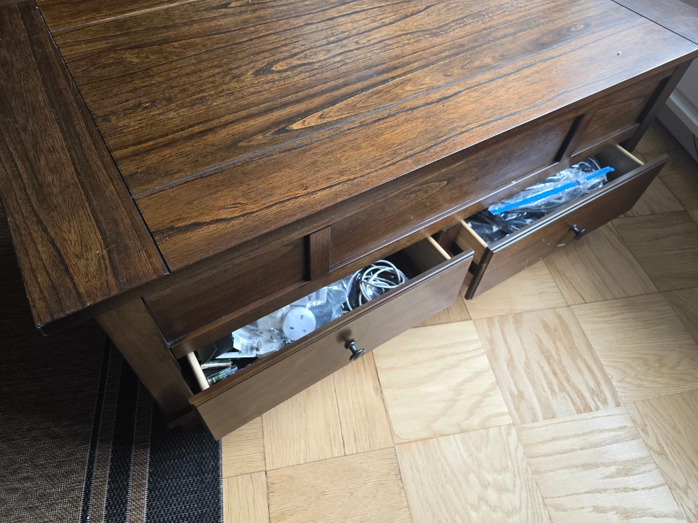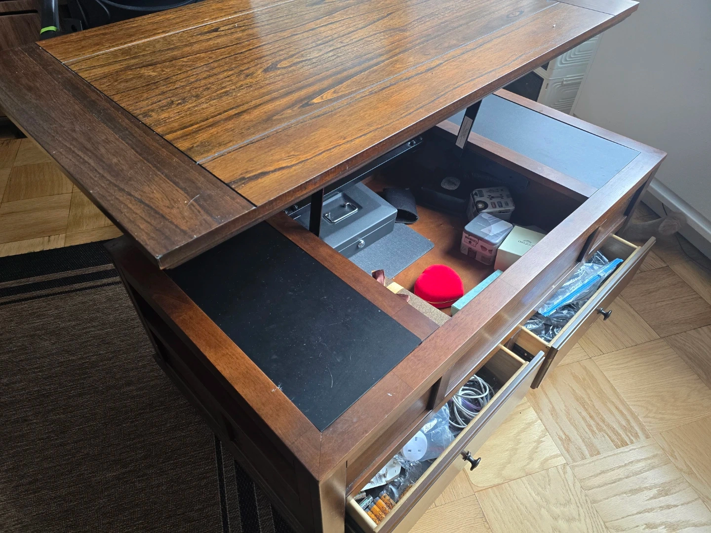 This dark wood coffee table features a lift-top design for hidden storage. It also has two drawers on the front for additional organization. Plenty of space for remotes, books, or decor!