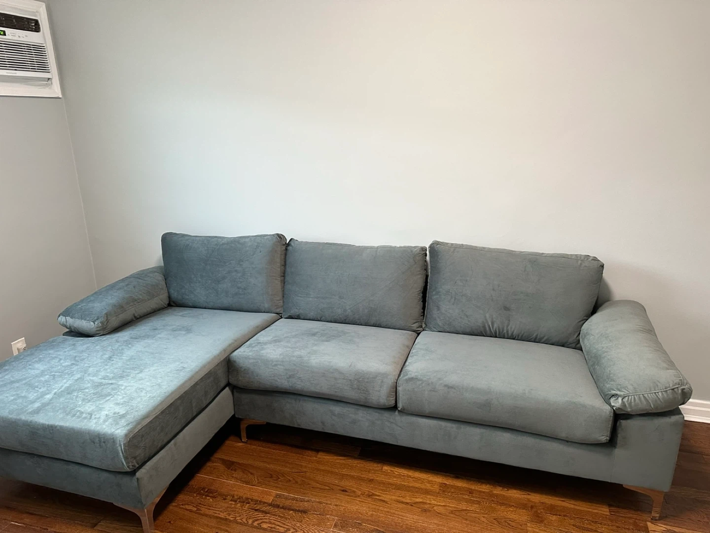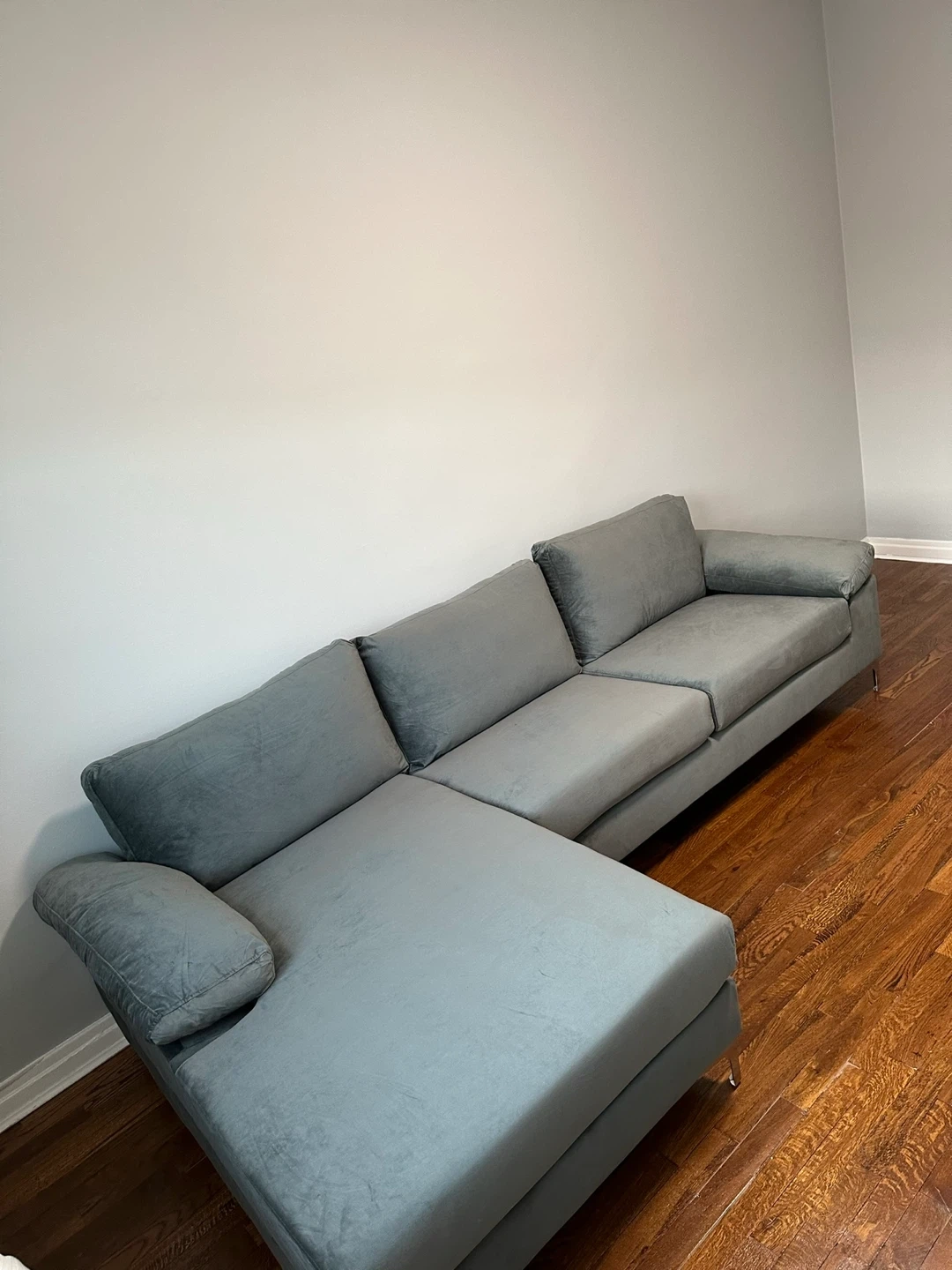 This is a comfortable gray sectional sofa with a chaise lounge. It's upholstered in a soft fabric, perfect for lounging. The sofa features plush cushions and a modern design.