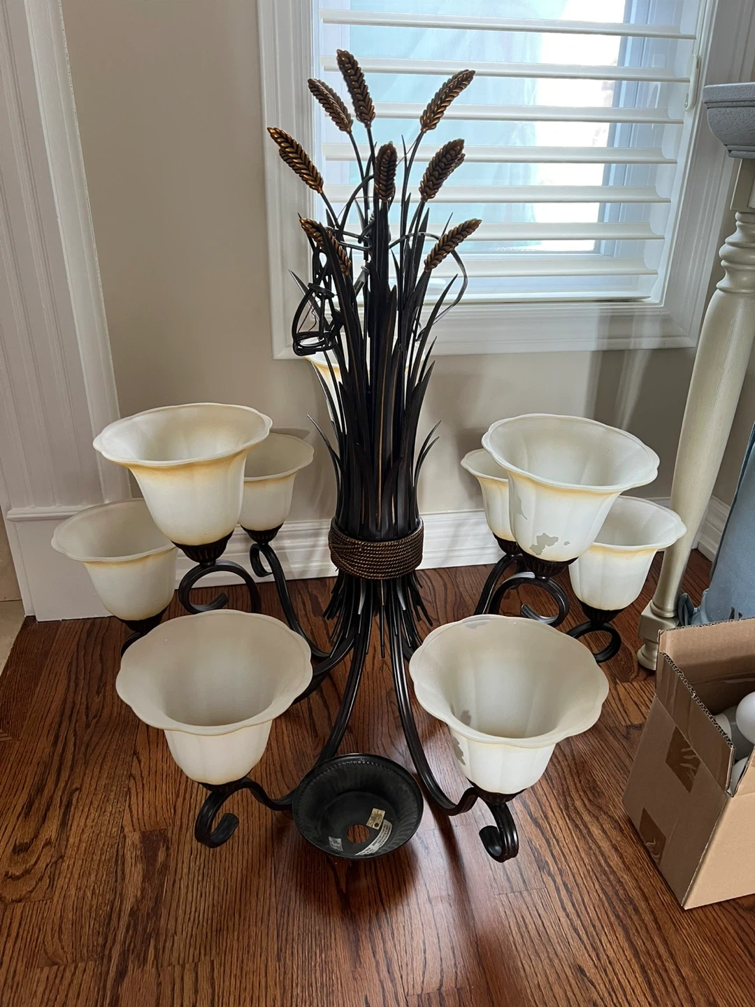 Selling a unique chandelier featuring a wheat stalk design and tulip-shaped shades. There are 7 shades in total, and the chandelier frame appears to be made of dark metal. Some of the shades have some wear and tear, as seen in the photos. It's a statement piece that could add a touch of rustic charm to any room