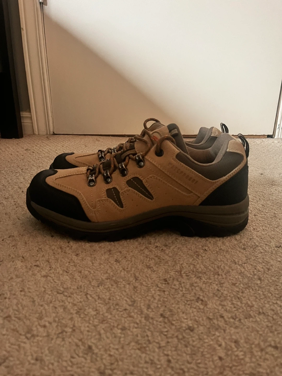 Tan and black waterproof hiking shoes. Lace-up closure with durable sole. Suitable for trails and outdoor activities. Only used once; in great condition.