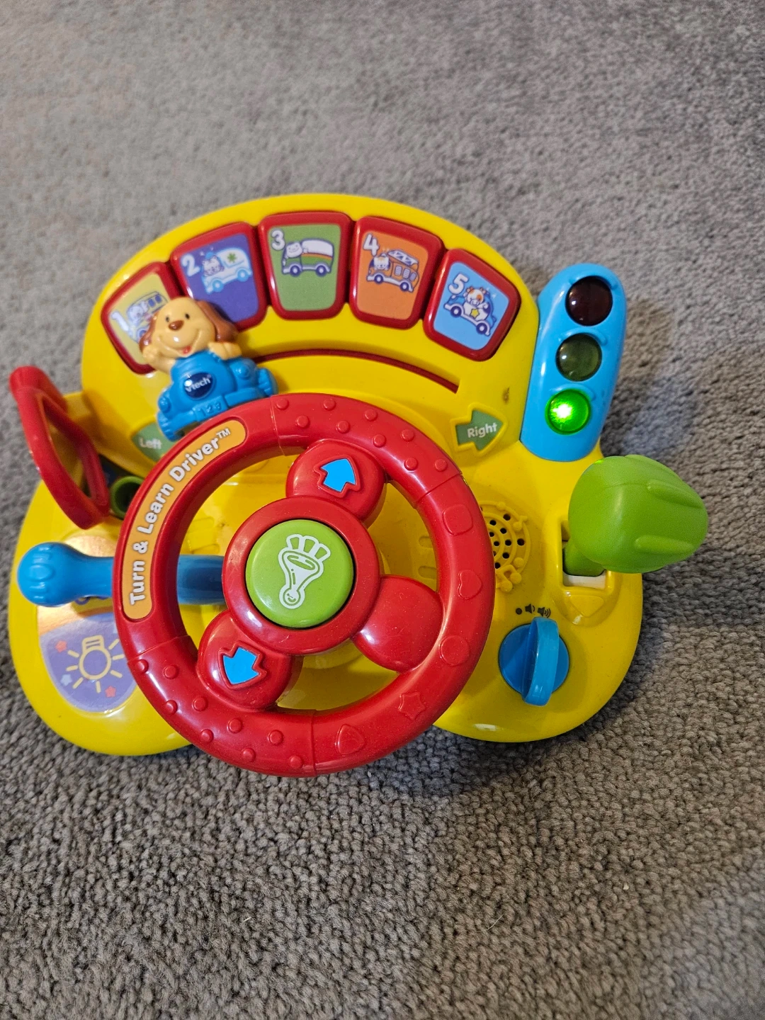This VTech Turn & Learn Driver steering wheel toy is yellow with red accents. It features buttons and sounds to engage young children. It's designed to mimic a car's dashboard and steering wheel for interactive play.