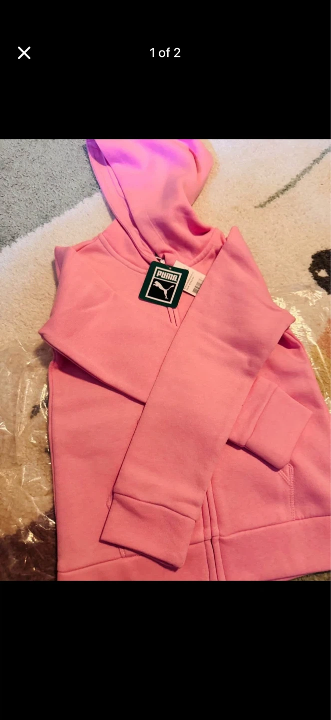 A pink zip-up hoodie from Puma for kids. It's a size small. Made with a soft material for comfort.