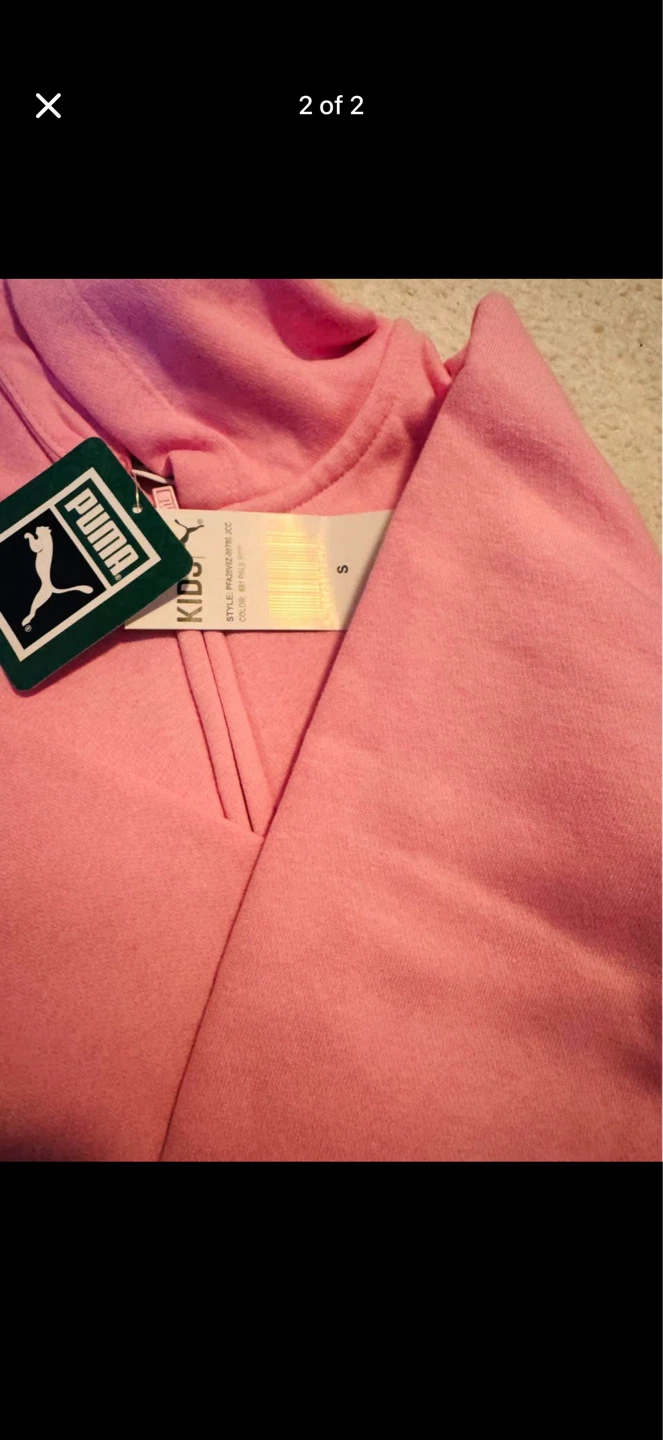 A pink zip-up hoodie from Puma for kids. It's a size small. Made with a soft material for comfort.