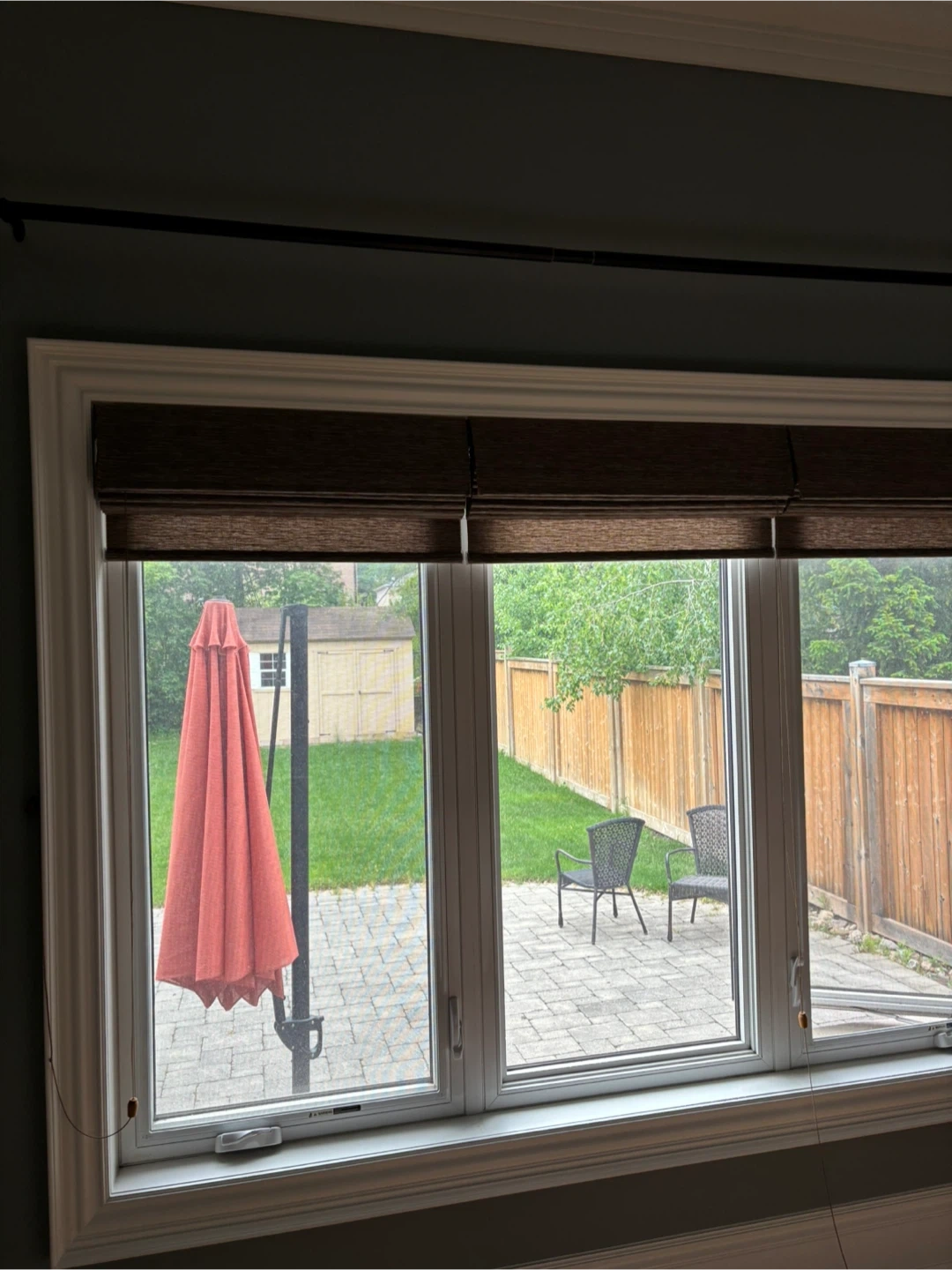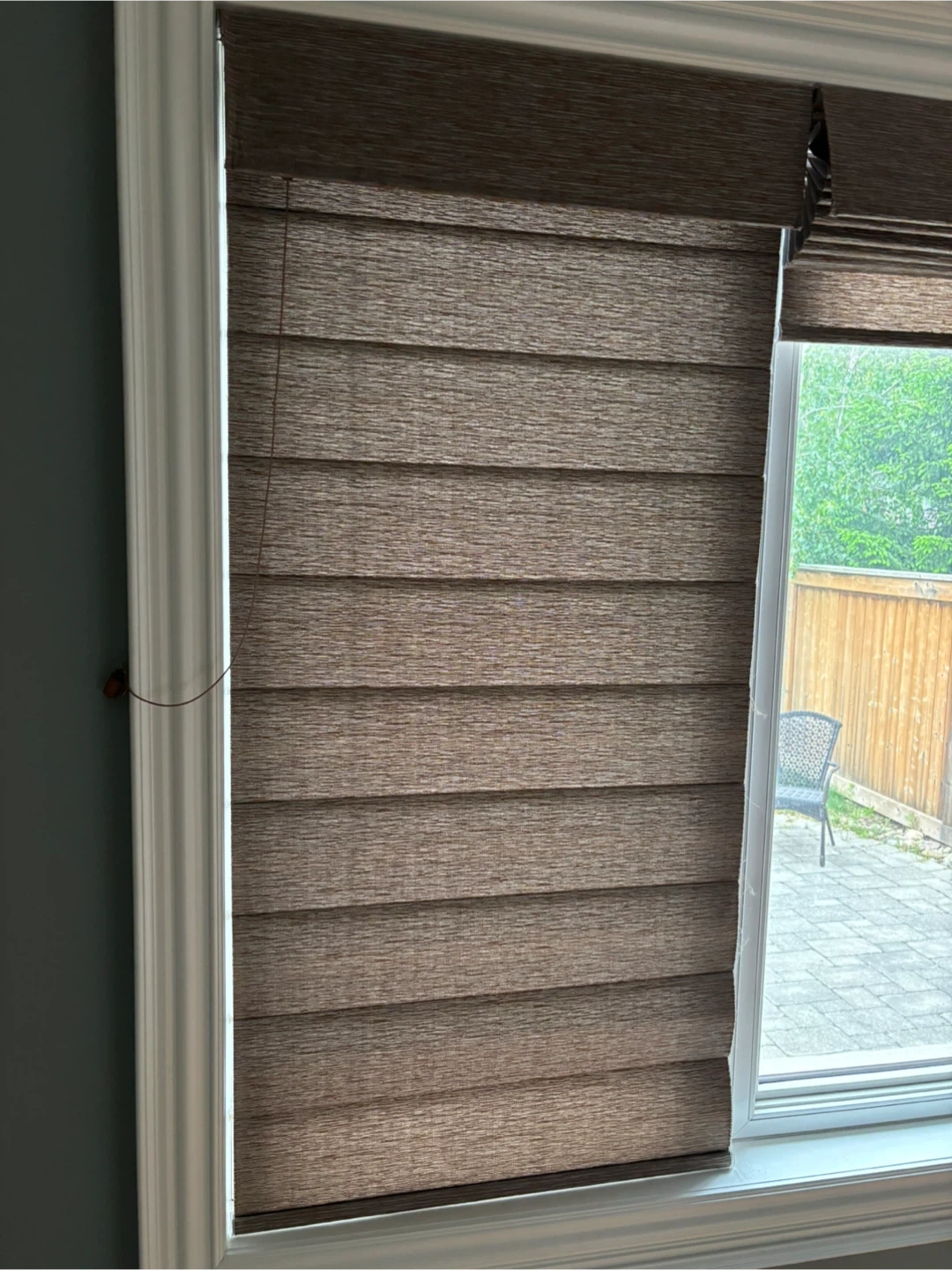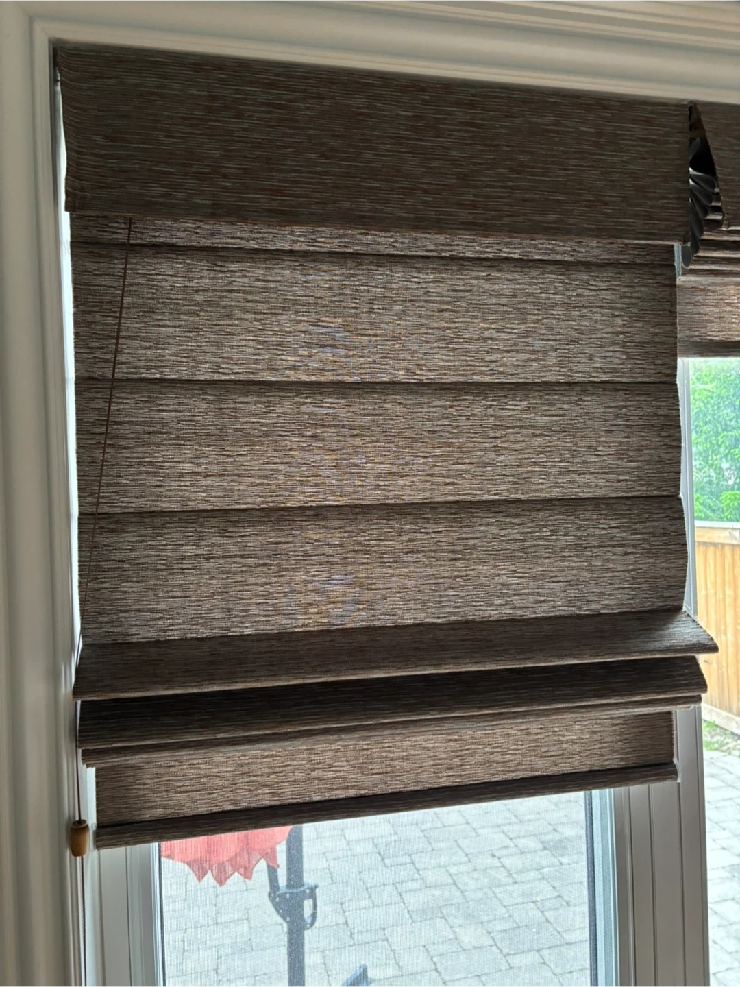 These are brown Roman blinds. They're made of textured fabric. The blinds offer privacy and light control.