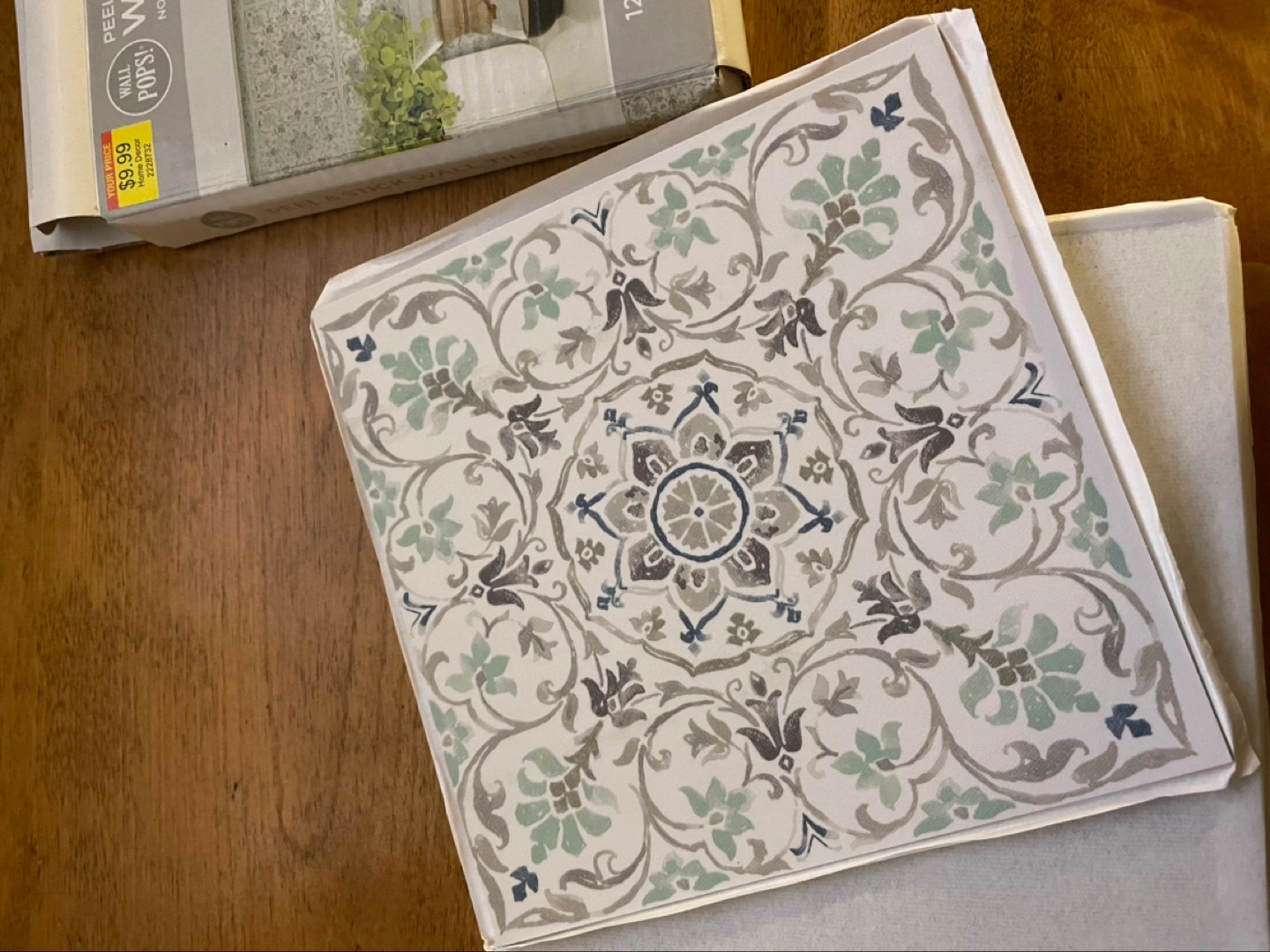 12 Peel and stick wall tiles. 6x6 inches. No grout. Strong adhesive. Beautiful floral pattern. Unused, in original packaging.
