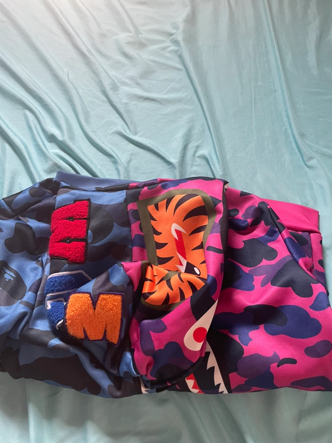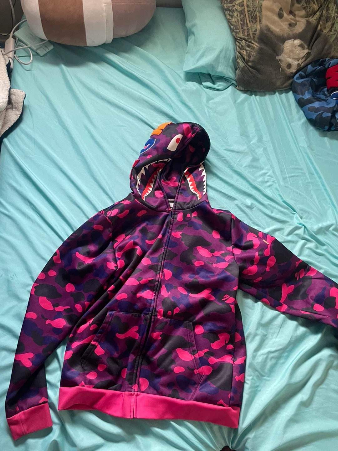 Iconic BAPE hoodie featuring the signature shark graphic. It's a cool piece with a unique camouflage pattern. This hoodie is eye-catching and stylish!