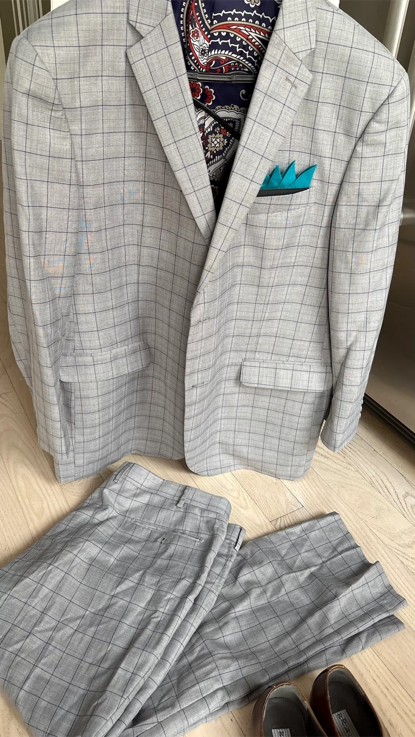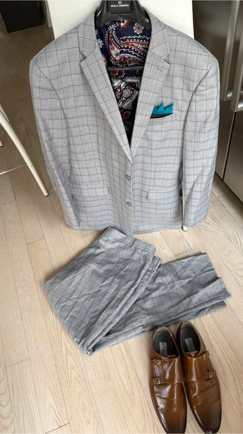 Selling a Marco Donatelli suit. It's a stylish grey plaid colour, and includes the jacket and pants. The lining has a cool paisley pattern and there's a teal pocket square detail
