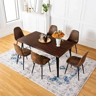 Modern rectangular dining table featuring a thick MDF walnut brown tabletop (160 cm length x 90 cm width x 71.6 cm height) and sturdy black powder-coated metal legs for durability and style. Perfect for seating 4-6 people comfortably.