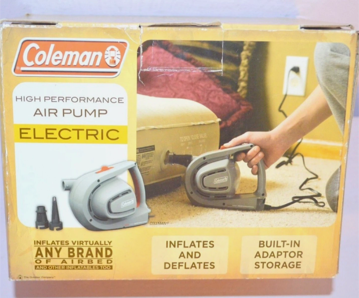 Selling a new Coleman electric air pump for high performance. It inflates and deflates virtually any brand of airbed and other inflatables. Features built-in adaptor storage.