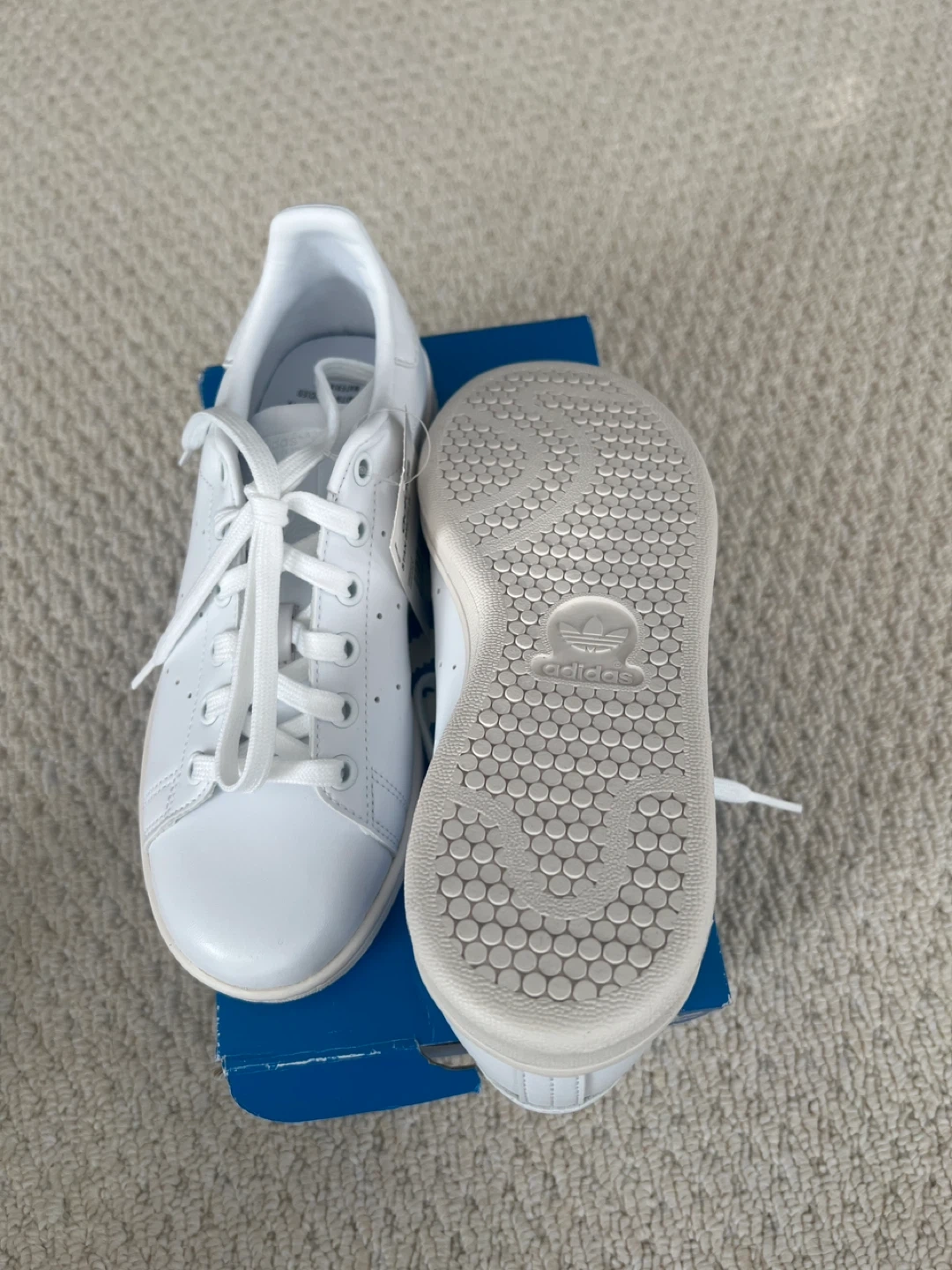 Classic Adidas Stan Smith W sneakers in white. Original box included. Leather upper. Size 6 fits like a 7.