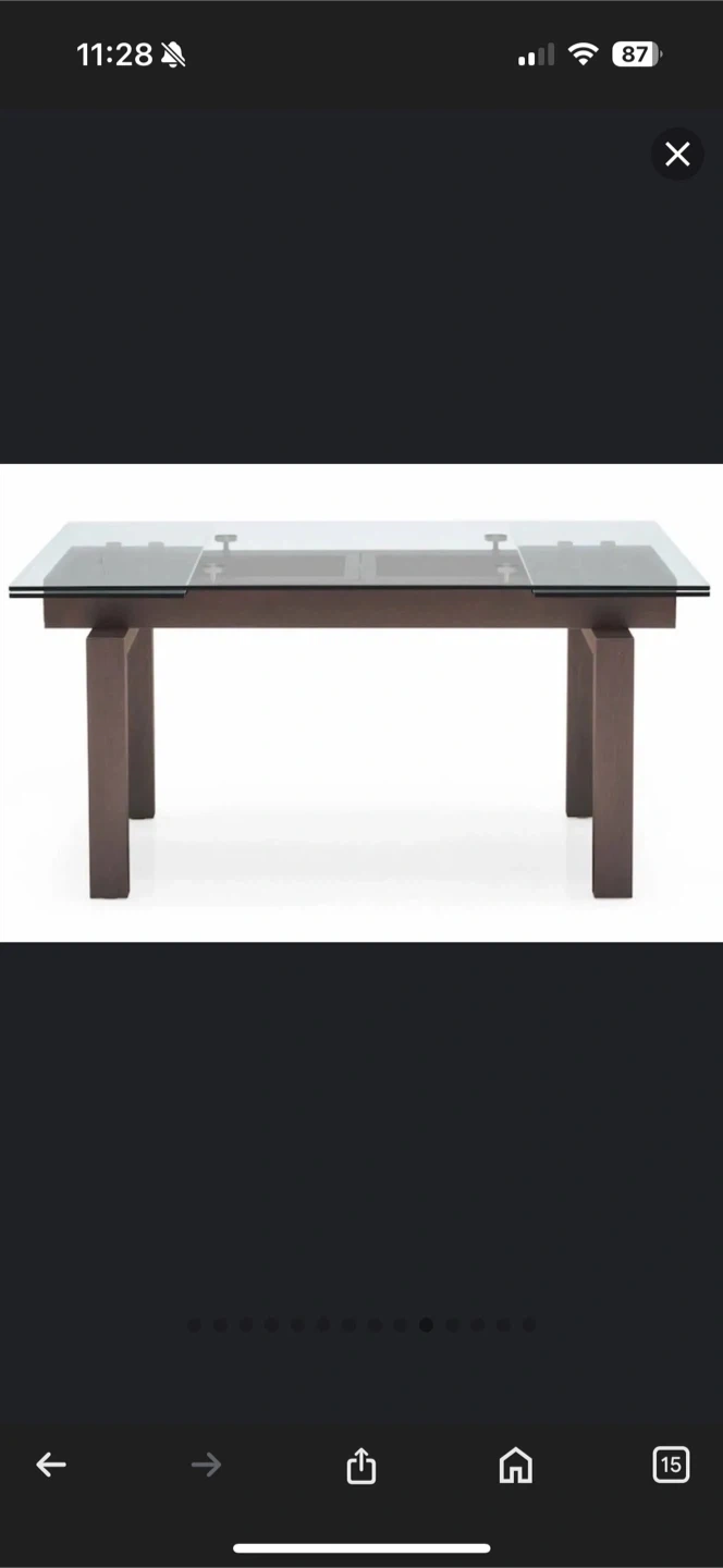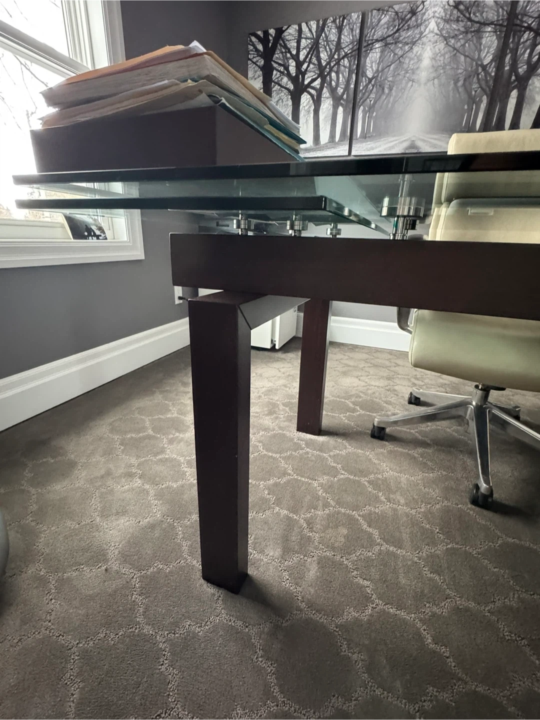 Modern office desk featuring a tempered glass top and sturdy dark wood legs. It's a spacious desk with a clean design, perfect for a home office setup. Plenty of surface area for your computer and work essentials.