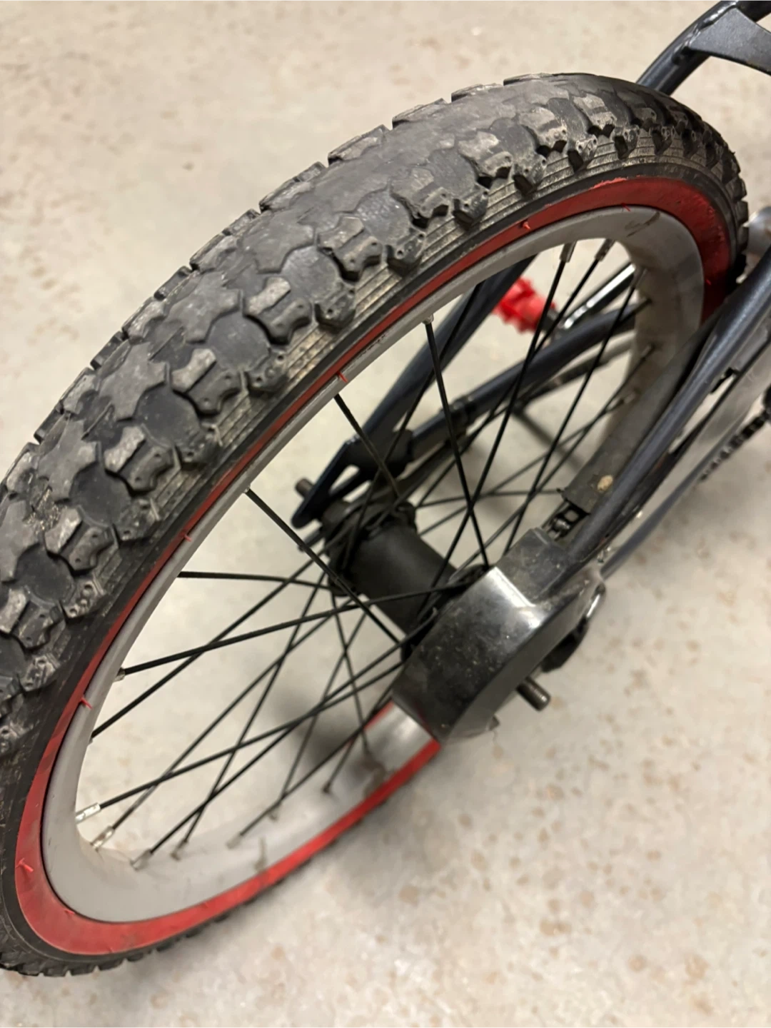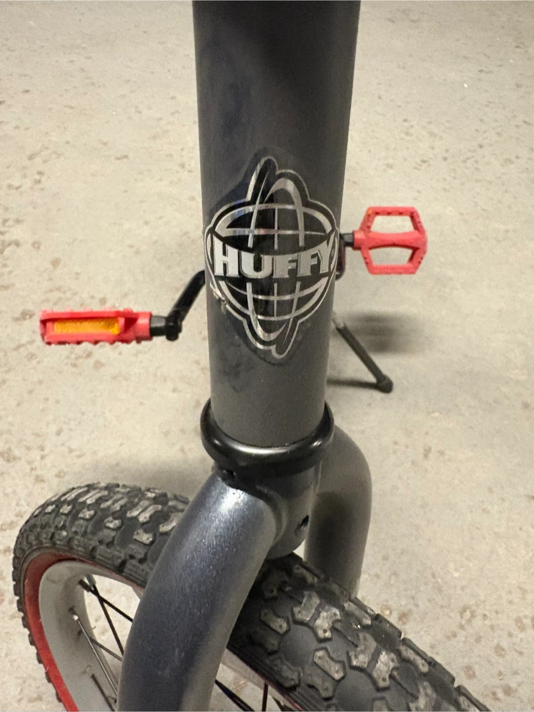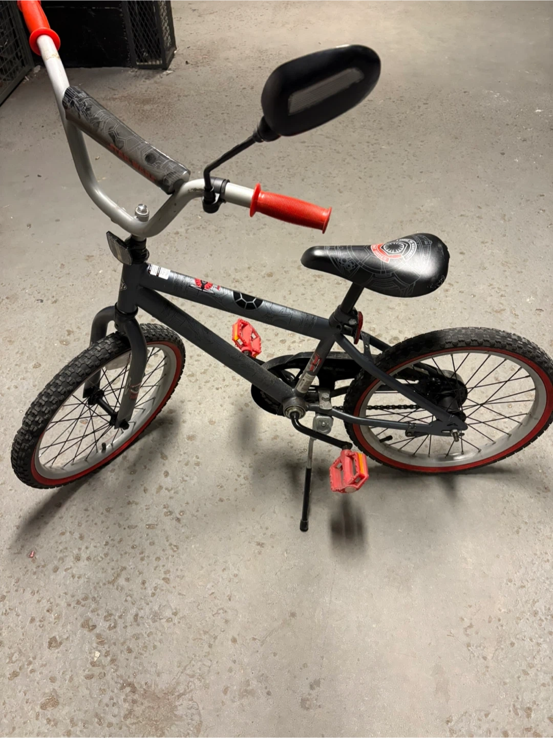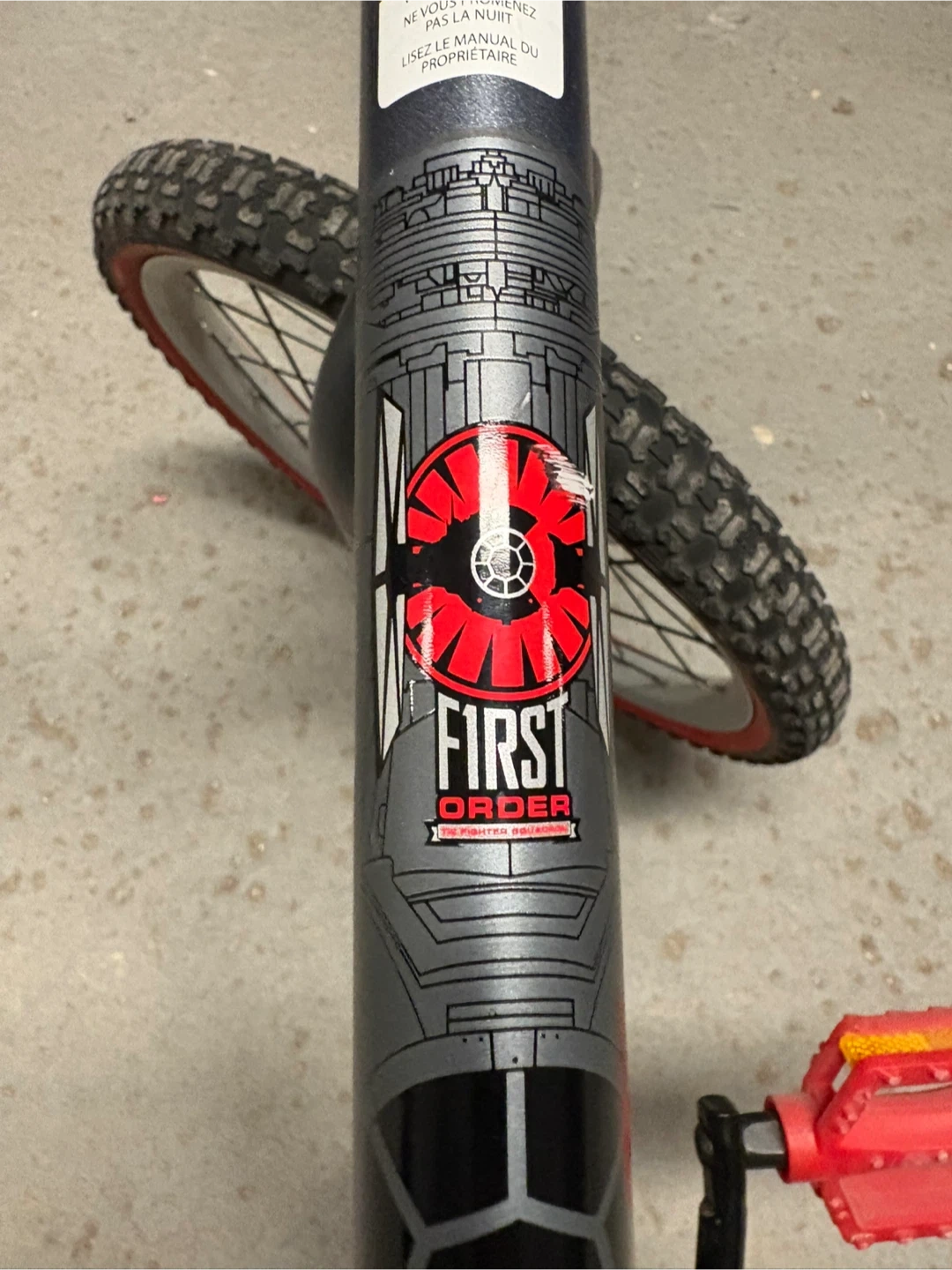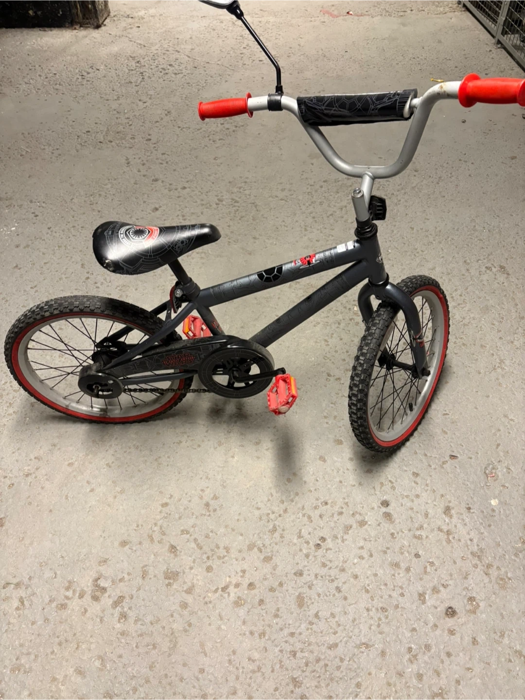 This grey Huffy BMX bike features a First Order Star Wars theme. It has red pedals and rims. The bike is suitable for kids.