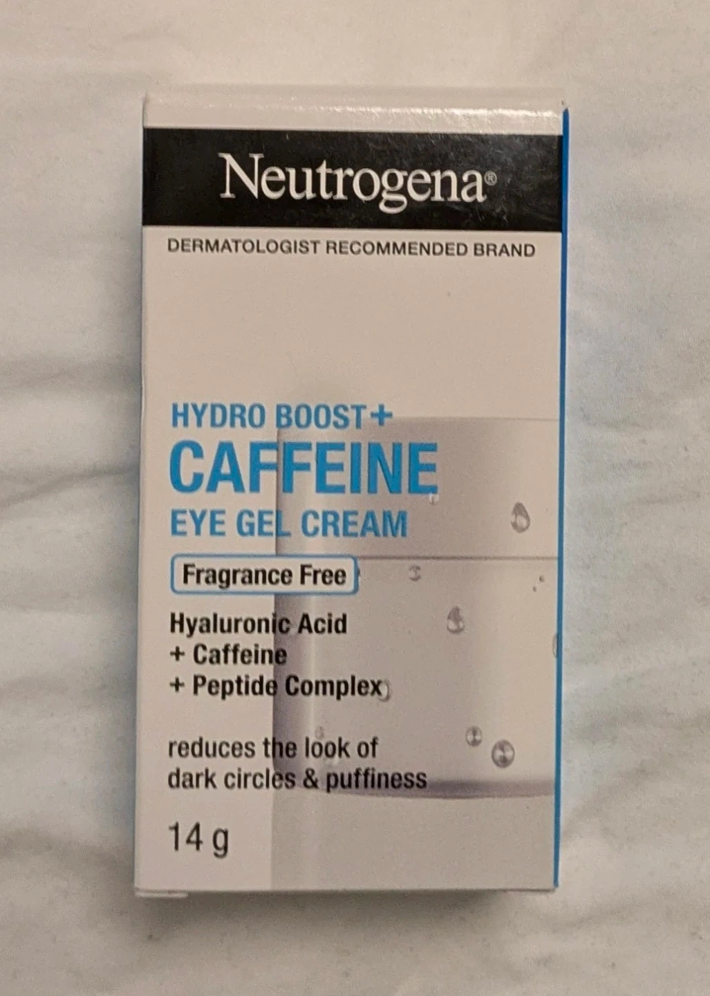 Neutrogena Hydro Boost + Caffeine Eye Gel Cream. Fragrance free formula with Hyaluronic Acid and Caffeine. It's designed to reduce the look of dark circles and puffiness. 14 g size.