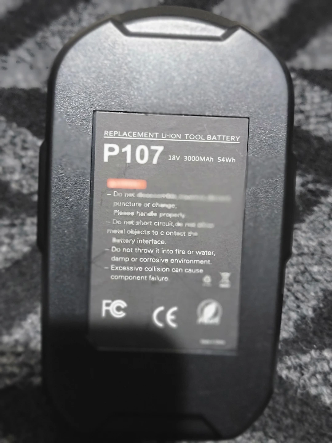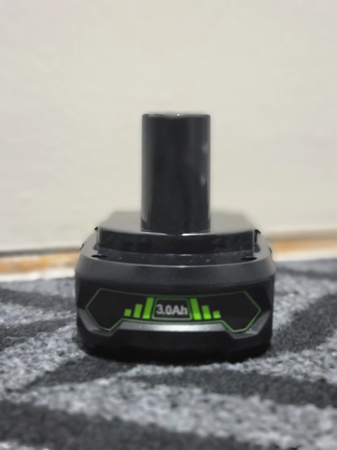 AFTERMARKET Li-ion tool battery, model P107. It's 18V, 3000mAh, and 54Wh. Features a 3.0Ah capacity indicator. This battery is compatible with all RYOBI ONE+ power tools. Battery is black and green colour and matches with tools well