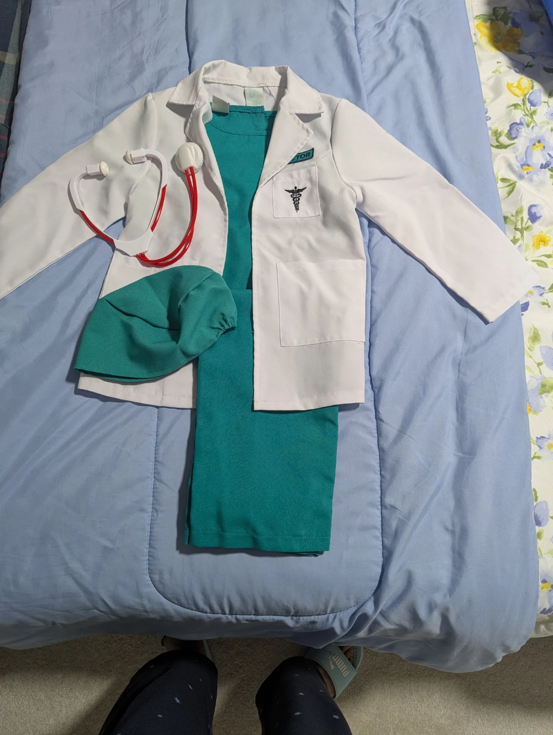 This is a kids' doctor costume set. It includes a white lab coat, teal scrub top and pants, and a green scrub cap. A red and white toy stethoscope is also included. Perfect for imaginative play!