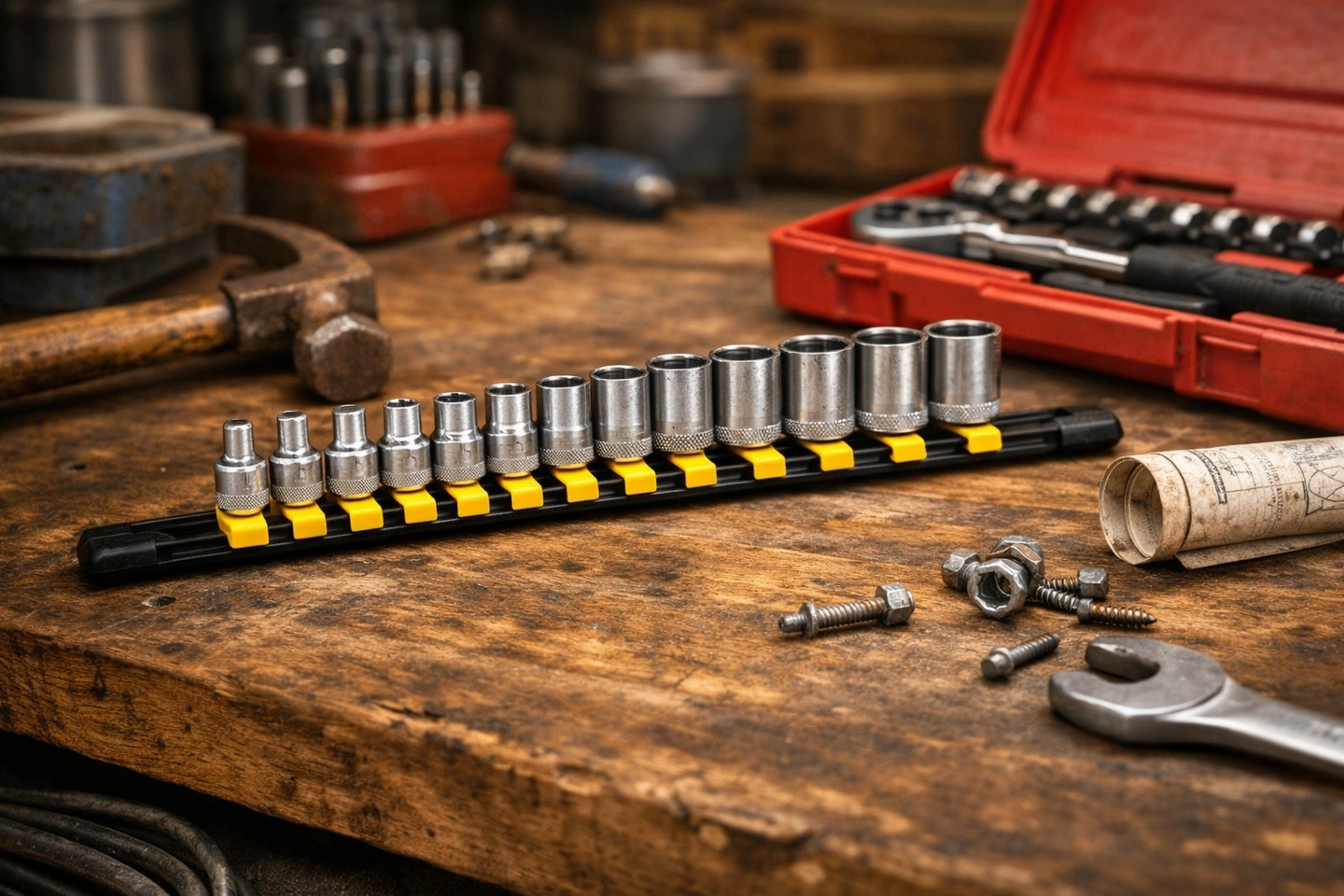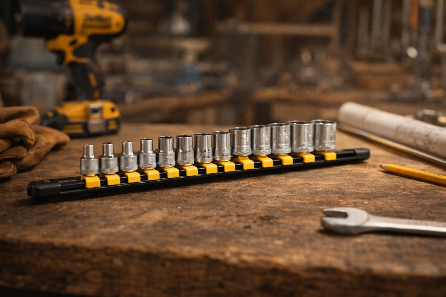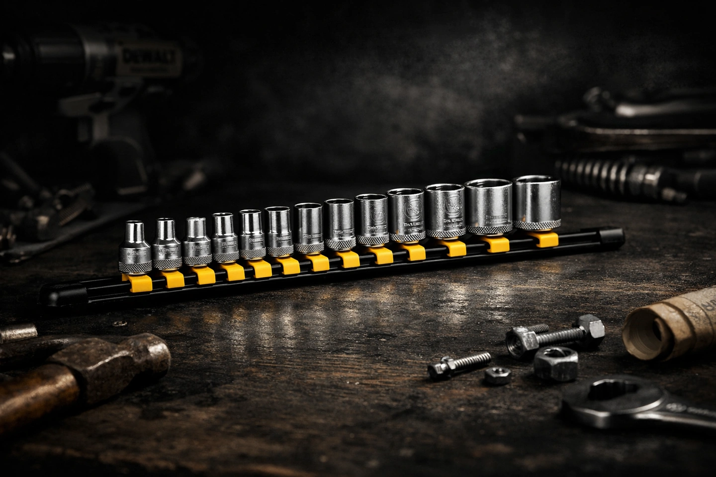 DEWALT 11‑piece SAE socket set, mounted on a locking rail for easy storage. Never used, only opened to verify contents. Perfect for mechanics, DIY, or anyone upgrading their tool kit.