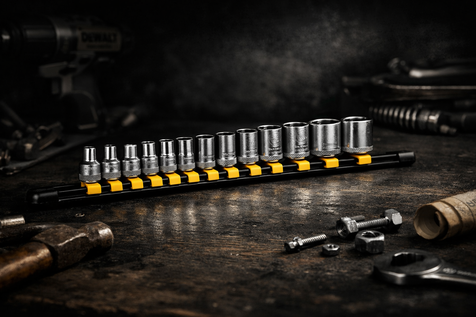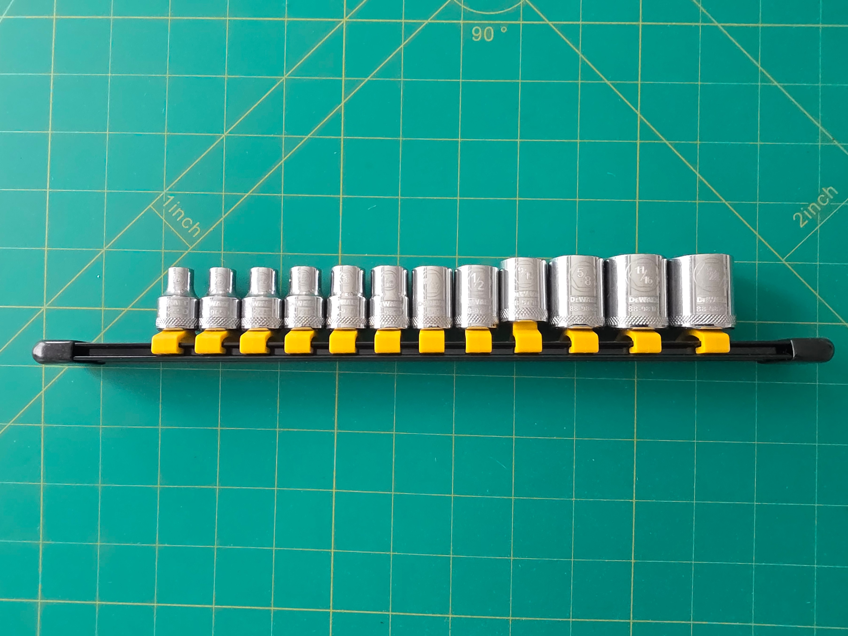 DEWALT 11‑piece SAE socket set, mounted on a locking rail for easy storage. Never used, only opened to verify contents. Perfect for mechanics, DIY, or anyone upgrading their tool kit.