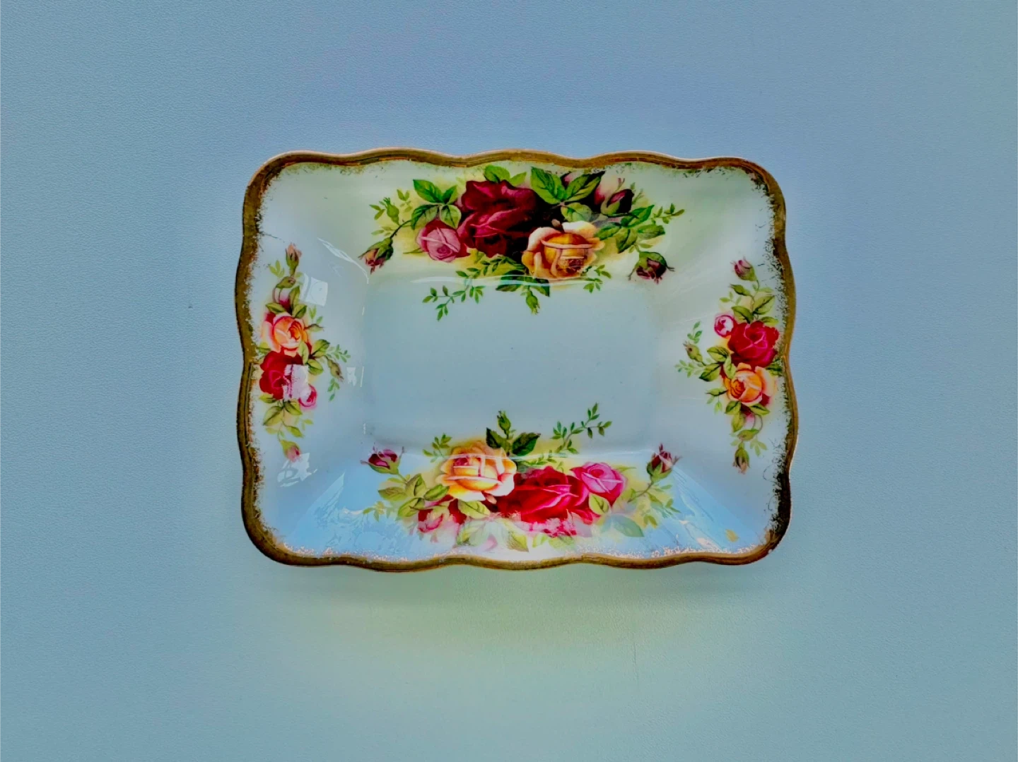 A delicate Royal Albert dish featuring the beloved Old Country Roses pattern. It's made of fine bone china and has a scalloped gold trim. This piece is perfect for holding small trinkets or as a decorative accent.